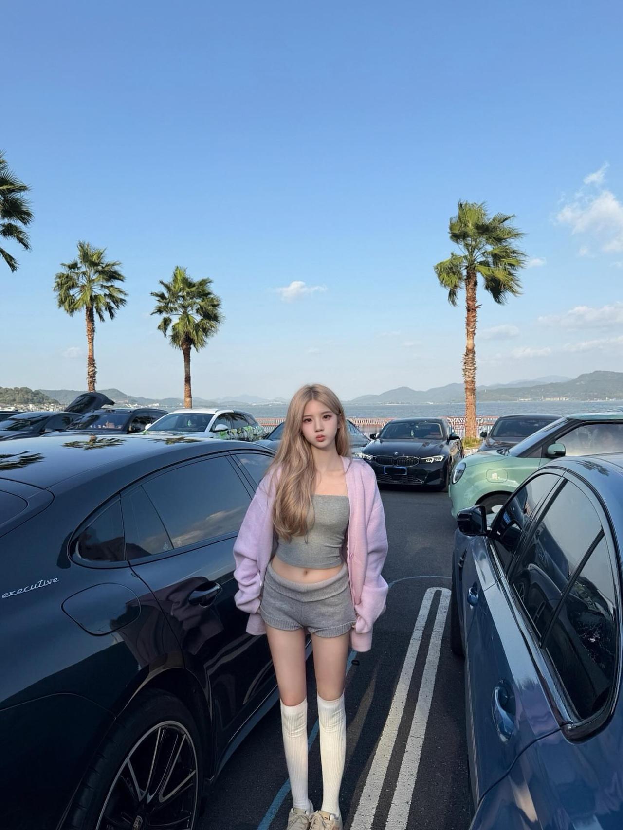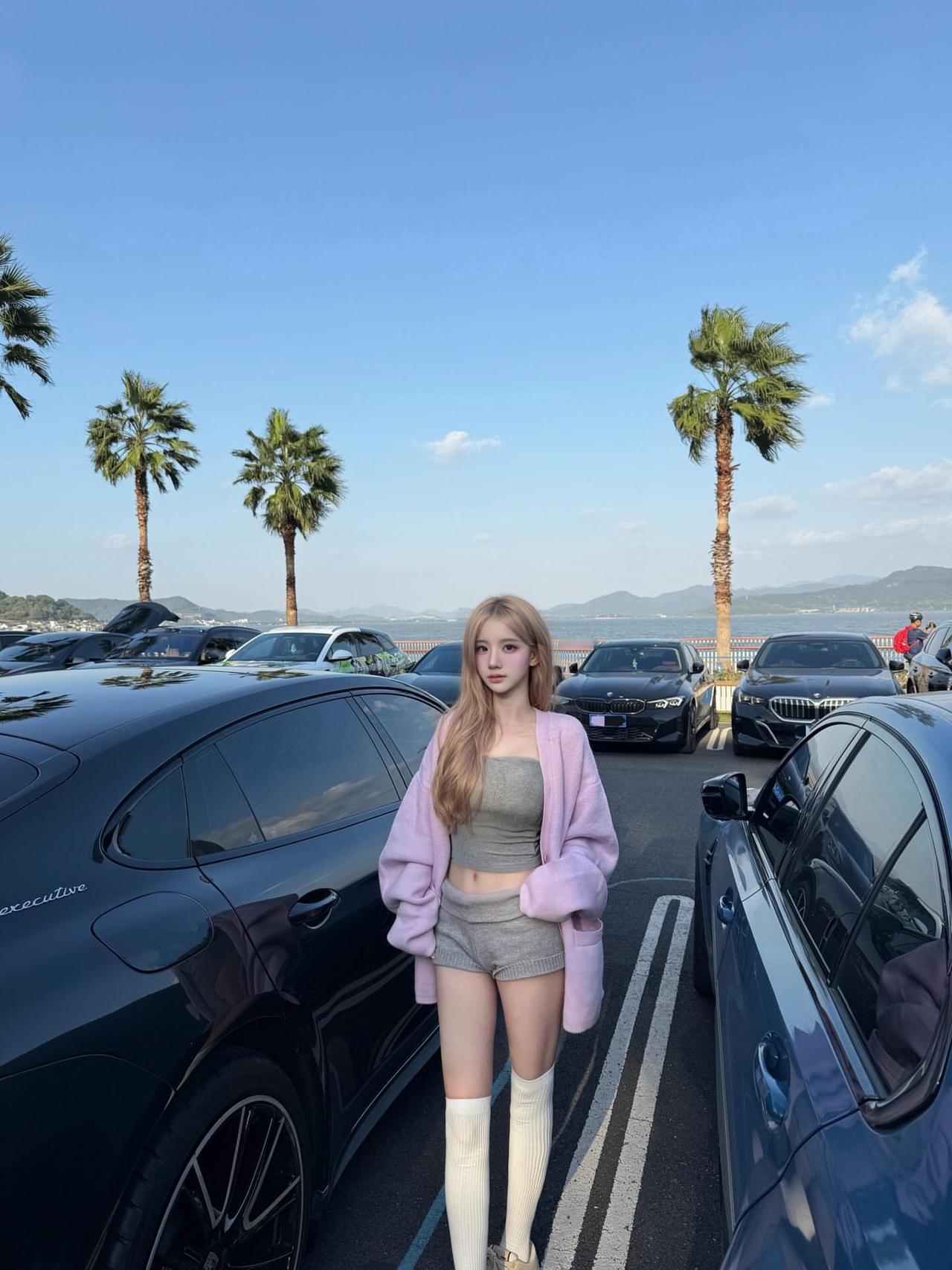 粉衣美人倚车坐,轻纱拂面映夕阳。女人怎样穿搭,更显气质 如何拍出户外氛围感美女?