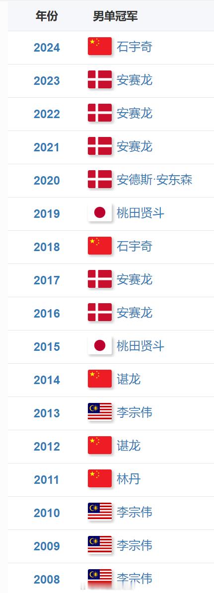 2025年世界羽联年终总决赛 安赛龙获得过五次总决赛冠军,排名第一而李宗伟则获得过四次,排名第二热点现场