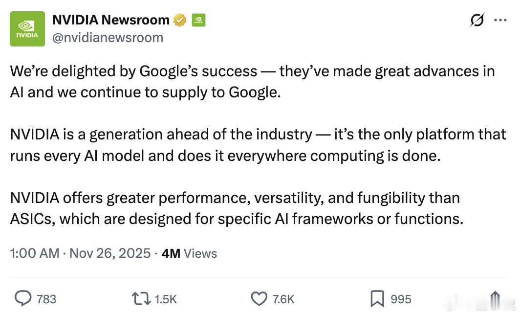 谷歌TPU抢走英伟达营收谷歌芯片开始挖英伟达墙角听闻谷歌Gemini 3全程用自研TPU训练,英伟达坐不住了。老黄罕见发声明,一边客套恭喜谷歌,一边强调自家地位:"我们是唯一能兼容所有AI模型、覆盖所有计算场景的硬件平台。相比专用芯片,英伟达方案性能更强、适用性更广、通用性更灵活。"翻译过来就是:你们那芯片只能跑自己的模型,我的GPU才是业界标准。之所以如此,是因为谷歌正在动英伟达的核心盘子——开始向Meta、大型金融机构推销"在你们自己数据中心部署TPU"的方案。据知情人透露,Meta已在跟谷歌谈,计划2027年花数十亿美元用TPU训练新模型,明年就从谷歌云租用芯片。谷歌云高管预测,这类业务可能带来数十亿美元年收入,直接抢走英伟达10%的营收。谷歌这次推销有两大卖点:一是安全合规。客户可以把敏感数据留在自己的数据中心,不用上传云端。二是性能优势。Gemini 3已经证明TPU能高效跑AI模型,特别适合高频交易这种需要低延迟的场景。为了让客户更容易上手,谷歌还专门开发了"谷歌版CUDA"——TPU command center。虽然谷歌自己的编程语言Jax普及度不高,但谷歌承诺客户可以直接用熟悉的PyTorch工具,不用重新学Jax。而且,谷歌开始挖英伟达的铁盟友。今年夏天,谷歌跟小型云服务商Fluidstack谈成了协议,要在纽约数据中心部署TPU。谷歌给的条件是:如果你付不起租金,我给你32亿美元兜底。这招直接复刻了英伟达当年拉拢CoreWeave的套路。谷歌还在接洽为OpenAI建英伟达芯片数据中心的Crusoe,以及向微软和OpenAI出租英伟达芯片的CoreWeave。而老黄的反击方式是:用钱砸。上个月,谷歌前脚刚宣布给Anthropic供应100万个TPU,老黄后脚就向Anthropic投资数十亿美元,换来对方继续用英伟达GPU的承诺。OpenAI想从谷歌云租TPU的消息一出,老黄立马谈成初步协议,向OpenAI投资高达1000亿美元。虽然英伟达发言人辩称"投资并未强制要求购买GPU",但意图已经很明显了。