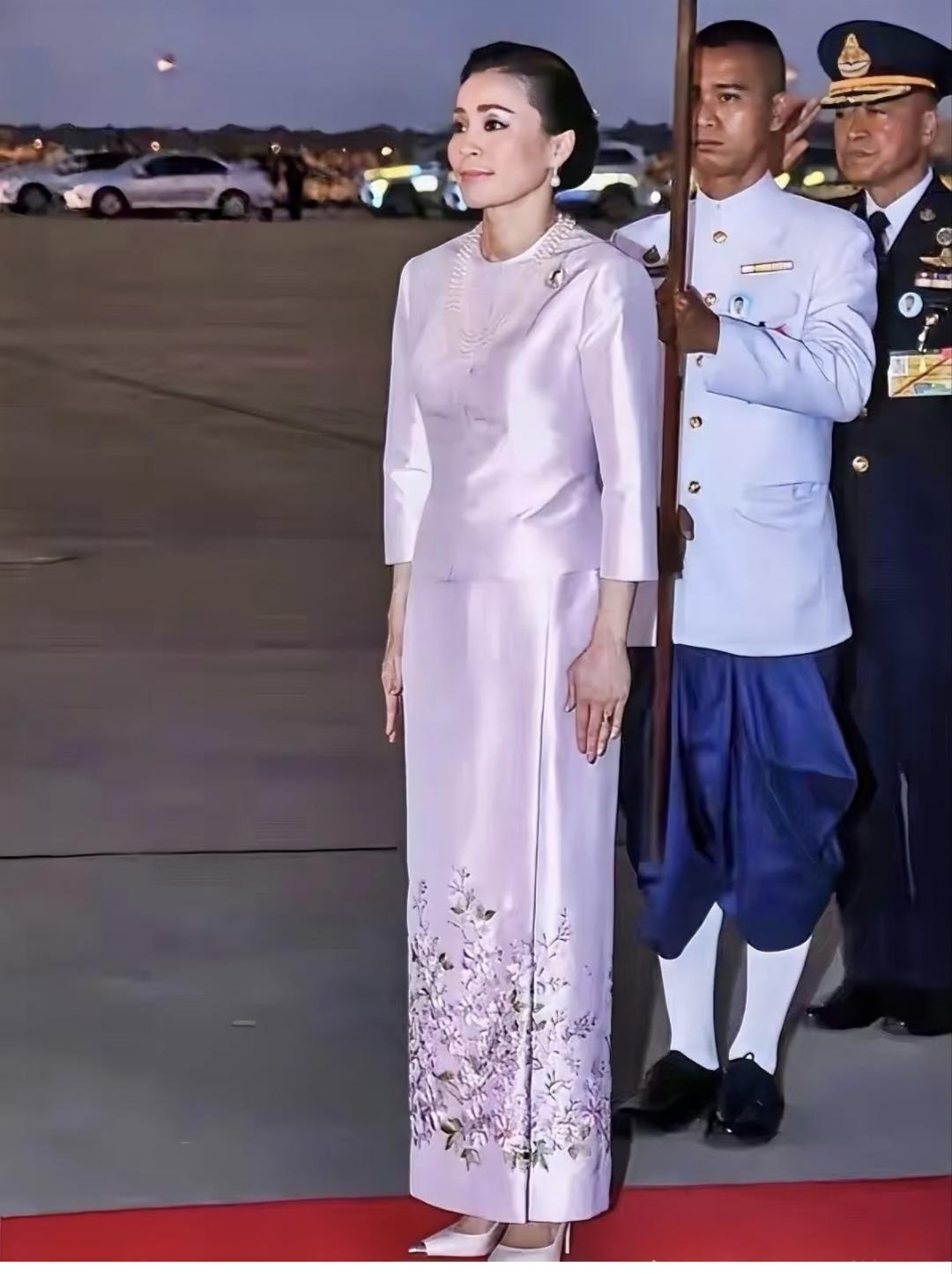 苏提达王后仪容仪表堪称典范,看看这是她在机场等候的情景。先说这站姿,笔管条直,头仰起的恰到好处,微微抬起,目视前方。尤其这双手,笔直地垂下,真引人注目啊。 正式场合,她永远是盘起的卷子头型,文雅大方。这着装,藕荷色修身长款套裙,浅色高跟皮鞋,往那那一站,真是如清水芙蓉,亭亭玉立,婀娜多姿,优雅之美。确实是国之门面!