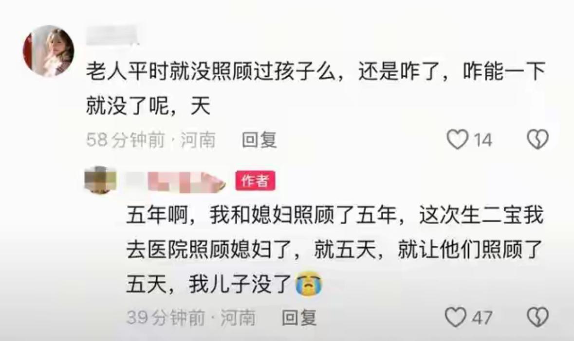 “儿子没了,仅仅5天,就因为这5天,就因为让那个他们照顾了5天!” 这是河南一位父亲在网上反复说的一句话,字字都是泪。充满自责和怨恨。看的让人心碎,当看到网友的评论时,心里更是五味杂陈! 因去医院照顾刚生完二胎的妻子,于是把儿子托付给爷爷奶奶照顾,可没想到,就在这期间儿子高烧不退,几度抽搐惊厥,虽然最后火速赶到医院,但也未能挽救回那幼小的的生命。 看到有网友把这一切矛头都指向了孩子爷爷奶奶,说他们没有责任心,是无爱才导致孩子突然离世,还说但凡有一点点爱心,也不至于酿成这样的悲剧。 看到这样的评论,扎心又刺眼。孙子的离世,我相信没有人比他们更难过。除了心痛更多的则是自责和懊悔!我们可以说他们无知但不能说无爱。 还没来得及分享喜悦,就跌入痛苦的深渊,这种切肤之痛,作为父母可以说是致命的。 作为网友,在我们感到难过的同时请停止对他们家人的伤害,伤口上撒盐比事件本身更让人难过!