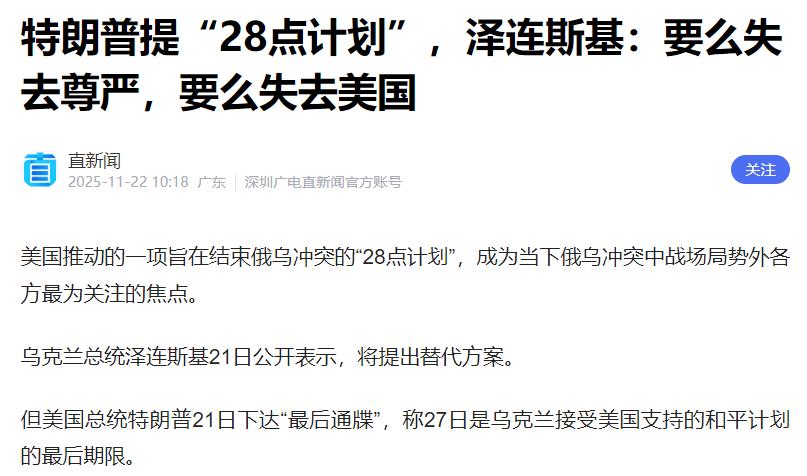 四年过去了,泽连斯基为了乌克兰四处奔波,但他终于公开表示,乌克兰从今天起,将面临艰难的选择,要么失去尊严,要么失去合作伙伴。 事情的起因要从美国起草的“28点计划”说起,这份旨在结束俄乌冲突的方案,核心内容包括俄罗斯与乌克兰及欧洲缔结互不侵犯协议,同时要求乌克兰承诺不加入北约。 11月20日,乌克兰总统办公室证实已收到美方提交的草案,紧接着第二天泽连斯基就做出了回应。他在公开讲话中明确表示,乌克兰会提出自己的替代方案,但无论如何都“绝不会给敌人理由说是乌克兰不想要和平”。 这番表态既展现了不愿妥协的立场,又透露出一丝无奈——毕竟摆在他面前的,是一个近乎两难的抉择。而让泽连斯基如此纠结的,正是来自美国的压力。 美国总统特朗普在21日直接下达了“最后通牒”,明确指出27日是乌克兰接受这份和平计划的最后期限。更耐人寻味的是,特朗普并没有给泽连斯基“提出替代方案”的余地,只是单纯要求其同意美方方案,否则冲突将继续。 而据乌克兰方面消息,如果不在规定时间内签署,美国威胁将停止武器供应和情报共享,这对依赖美方支持的乌克兰来说,无疑是沉重打击。 就在特朗普发出通牒当天,美国陆军部长德里斯科尔还专门赴基辅与泽连斯基会谈,这场会面更像是一次“最后通牒”的当面传达。事实上,泽连斯基如今的处境早已埋下伏笔。作为北约的代理人,他现在已经站在了被放弃的边缘。 与此同时,美国内部对这份和平计划的态度也并不统一,共和党籍参议院军事委员会主席罗杰·韦克尔就公开表示强烈质疑,认为方案给予莫斯科过于有利的条件,这也是特朗普公布计划以来最具分量的共和党内反对声音。 但即便如此,特朗普政府推进计划的态度依然强硬,甚至有分析指出美俄已经在考虑不顾欧洲利益,分割这场冲突的最终收益。 这种“越俎代庖”的做法自然引起了欧洲国家的不满。德法英三国领导人在21日专门与泽连斯基通话,强调任何涉及欧盟和北约的协议,都必须获得欧洲伙伴同意或与北约盟友达成共识。欧盟委员会主席冯德莱恩也随后重申,相关条款的实施需要欧盟成员国的一致同意,并表态会持续支持乌克兰。 欧洲国家的这些反应,其实是在间接表达对美国单边行动的抗议——毕竟这场冲突最直接的影响,还是落在了欧洲大陆。 现在距离27日的最后期限越来越近,泽连斯基的每一个决定都关乎乌克兰的未来。接受美方计划,意味着要在关键利益上做出让步,这对乌克兰民众来说可能难以接受;而拒绝的话,又可能失去美国这个最关键的合作伙伴,武器和情报支持的中断将让前线局势更加艰难。 这场看似是乌克兰的选择,实则早已被大国博弈所左右,泽连斯基这个“代理人”的尴尬处境,恐怕短期内很难改变。