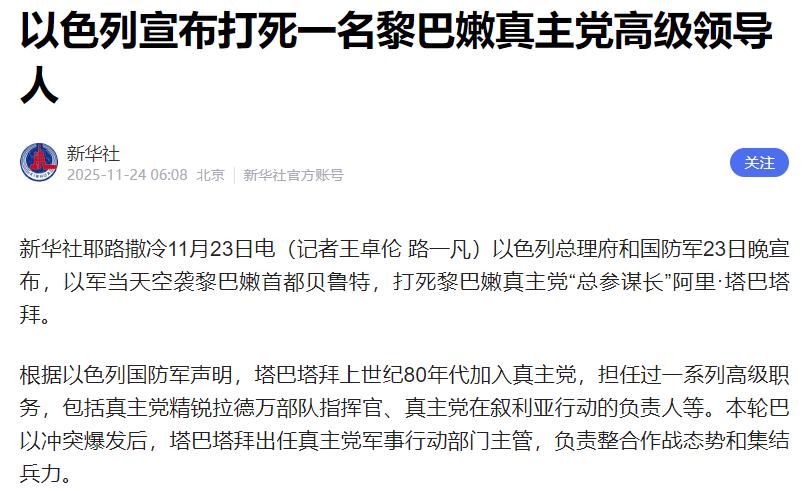 黎巴嫩真主党数万大军总司令,还在准备战斗!就在没有一场交战,没有一名士兵死亡的情况下!以色列定点清除了-黎巴嫩真主党军事总司令。 11月23日,以色列总理办公室突然发表声明,宣布以军当天在黎巴嫩首都贝鲁特市中心实施了一次"精确打击"。这场空袭直接造成了5人死亡、28人受伤的后果,除了塔巴塔拜之外,还有4名真主党成员一同丧命。 以色列方面给出的理由很直接,称塔巴塔拜一直在推动真主党"重建组织能力并为下一轮战事做准备",这种行为对以色列构成了持续威胁,所以才出手清除。 有意思的是,袭击当天恰逢黎巴嫩的独立日,这个时间点的选择让事件更添几分敏感性。 真主党随后发表声明,用"背信弃义"形容这次空袭,强调塔巴塔拜是组织的"杰出指挥官",并誓言会继续与以色列对抗。而以色列国防军总参谋长扎米尔更是直接放话,称以军"可能重返此前曾战斗过的地方再次作战",目前正在为此做准备。 以色列的这手操作着实够突然,尤其是在巴以停火协议刚达成不久的背景下,简直像是平静湖面投下了一颗巨石。 说起来这停火协议也挺有意思,黎以之间的停火其实从去年11月27日就已经生效,但以色列一直拒绝从黎南部全面撤军,还总以真主党违反协议为由频频发动空袭。 最近这段时间,以方的空袭频次和力度更是明显加强,10月底黎巴嫩总统奥恩还公开表示愿意和以色列谈判解决领土问题,结果换回来的却是更猛烈的袭击。 这边加沙地带的停火协议也没安稳多久,自10月10日生效以来,以色列和巴勒斯坦方面就互相指责对方违反协议,巴勒斯坦卫生部门统计的数据显示,这段时间加沙已有236人死亡、600人受伤。 国际社会其实一直没闲着,11月初土耳其、沙特阿拉伯、约旦等7个国家的外长还专门在伊斯坦布尔开会,一致同意要维护加沙停火协议,推动"两国方案"实现持久和平。 可以色列这番操作,明显是把这些努力当成了耳旁风。黎巴嫩总统奥恩当天就强烈谴责这次空袭,称以色列"无视各方多次要求其停止对黎巴嫩侵略的呼吁,拒绝执行国际决议",再次呼吁国际社会果断干预。 现在的局面确实有点棘手,真主党在黎巴嫩有着深厚的群众基础和武装力量,以往类似高级领导人遇袭后,往往会引发火箭弹袭击等报复行动。以色列这次主动升级局势,不仅让黎以边境再次紧张起来,还可能波及整个中东地区的稳定。 毕竟停火协议的墨迹还没干透,以色列的这种单方面军事行动,无疑是给本就脆弱的地区和平又蒙上了一层阴影。