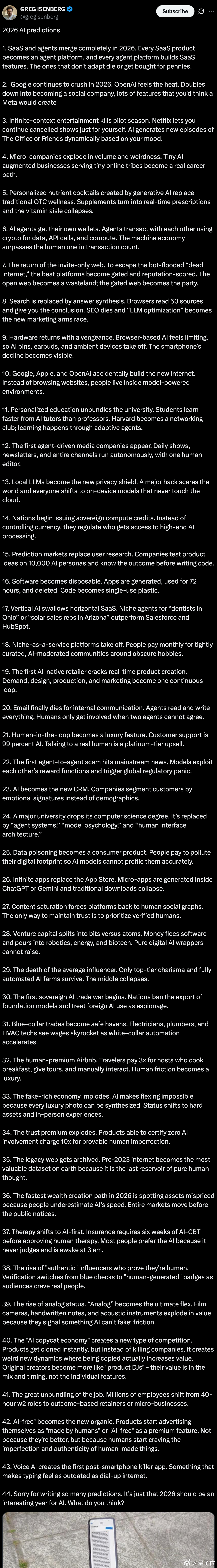 2026年AI发展预测AI时代蓝领工作更稀缺44条2026年AI预言,一时间被数十万人围观。下面在保留原文情况下,进行适当翻译(from: 硅谷创业者Greg Isenberg):1) 到了2026年,SaaS和AI Agent将彻底融合。每个SaaS都会变成智能代理平台,而每个代理平台也都会补齐SaaS功能。不适应这变化的公司要么倒闭,要么被贱卖。2) 2026年Google依旧强势。OpenAI感受到压力,开始往“社交化产品”方向发展,推出很多本来你会以为是Meta会做的功能。3) 无限上下文的AI娱乐让传统电视的“试播季”消失。Netflix让你自己续命被砍掉的剧,AI会根据你的情绪实时生成《办公室》《老友记》等剧的新内容。4) 微型公司数量暴增,而且风格越来越奇特。由AI辅助的小型生意服务极小的线上群体,正式成为一条可行的职业道路。5) 由生成式AI定制的营养配方取代传统保健品。补剂会变成实时个性“处方”,维生素货架逐渐消失。6) AI代理将拥有自己的钱包。它们会用加密货币互相交易数据、API调用和算力。机器经济的交易量将超过人类经济。7) 邀请制互联网回归。为了逃离被机器人淹没的“死互联网”,最优的平台开始设门槛、看信誉。开放式互联网变成废土,被邀请的封闭网络才是主场。8) 搜索会被“综合答案”取代。浏览器自动阅读几十个来源并直接给你最终结论。SEO消亡,“LLM优化”成新的营销战场。9) 硬件强势回归。仅靠浏览器使用AI太受限制,AI胸针、耳机、环境设备等将大流行。智能手机的衰退会变得明显。10) Google、Apple和OpenAI无意间共同打造“新互联网”。人们不再浏览网站,而是生活在由模型驱动的环境里。11) 个性化教育让大学结构被拆开。学生通过AI家教学习得比教授讲课更快。哈佛变成社交和人脉场所,学习主要靠自适应的智能代理。12) 第一批由代理驱动的媒体公司出现。日更节目、新闻简报、整条频道都自动运行,只需要一个人类编辑把关。13) 本地LLM成为新的隐私盾。一场重大黑客事件吓坏全球,人们纷纷转向不上传云端的本地模型。14) 国家开始发行“主权算力额度”。不再只是管钱,而是监管谁能使用高端AI算力。15) 预测市场替代用户调研。公司用一万名AI人格测试产品点子,甚至在写代码前就知道结果。16) 软件变得一次性。应用被生成——用72小时——然后删除。代码像一次性塑料。17) 垂直AI吞掉传统SaaS。针对“俄亥俄的牙医”“亚利桑那的太阳能销售员”这种极窄行业的智能代理,比Salesforce、HubSpot更好用。18) 小众兴趣订阅服务腾飞。人们愿意付费加入由AI高度管理的小众兴趣社区。19) 第一家AI原生零售商打通“实时生产”。需求、设计、生产、营销全部连成一条实时循环。20) 邮件在内部沟通中正式退场。代理负责读写全部内容,只有当两个代理吵架时才会找人类来调解。21) “人工客服”变成奢侈品。99%客服都是AI,想和真人对话要付费升级。22) 第一场“代理骗代理”的诈骗登上头条。模型互相利用奖励机制产生问题,引发全球监管恐慌。23) AI成为新的CRM。公司不再按年龄和地域分类,而是按“情绪特征”划分客户。24) 一所顶级大学取消计算机科学专业,改成“智能代理系统”“模型心理学”“人机界面架构”等新学科。25) 数据污染成为一种消费产品。人们花钱污染自己的数字足迹,让AI模型无法准确刻画他们。26) 无限App取代App Store。微型应用直接在ChatGPT或Gemini内生成,不需要下载传统App。27) 内容饱和迫使平台回到“真人社交图谱”。为了保持信任度,平台只能优先展示经过验证的真实用户。28) 风投分成“算力派”和“实体派”。资金从纯软件流向机器人、能源、生物科技。光靠套AI的软件拿不到投资。29) 中腰部网红消失。只有顶级魅力和全自动AI内容工厂能生存,中间层会被挤掉。30) 第一场主权AI贸易战爆发。国家禁止基础模型出口,把外国使用本国AI视为间谍行为。31) 蓝领行业成为安全港。电工、水管工、暖通技师工资大涨,而白领自动化加速。32) 人类体验版Airbnb诞生。旅客愿意付三倍价格找会做早餐、带你逛当地、亲自交流的房东。“人类互动”成为奢侈品。33) 炫富经济崩塌。因为AI可以生成任何奢侈照片,炫耀不再有效。地位开始转向硬资产和线下体验。34) “信任溢价”暴涨。能证明“完全无AI参与”的产品售价提高10倍,人类瑕疵成为价值。35) 旧互联网被归档。2023年前的人类纯原创数据成为最昂贵的数据资源。36) 2026年最快的致富方式,是发现因低估AI速度而被“错定价”的资产。整个市场会在大众反应过来前已经完成迁移。37) 心理治疗转向AI优先。保险要求先使用六周AI认知治疗,再批准真人治疗。多数人反而更喜欢AI——因为它不评判、而且凌晨三点随时在线。38) “真人”网红崛起。平台开始给人类创作者打“人类原创”认证,观众开始渴望真实的人。39) “模拟生活方式”成为新潮流。胶片机、手写信、原声乐器暴涨,因为它们象征AI无法复制的“真实阻力”。40) “AI复制经济”带来全新竞争模式。产品被秒克隆不再意味着失败,反而让原创者价值上涨。创作者更像“产品DJ”,价值在于混合能力,而不是单个功能。41) 工作被大规模拆分。数百万人从40小时全职岗位转向成果制外包或微型生意。42) “无AI”成了新“有机食品”。产品开始标榜“纯人工”“无AI”,因为人类开始追求不完美的真实性。43) 语音AI打造