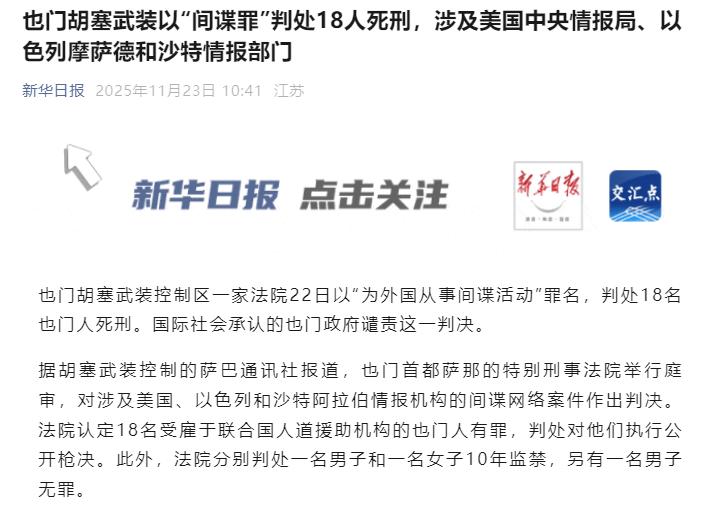 胡塞武装传出爆炸性消息!美国中央情报局,摩萨德和沙特的情报人员,纷纷落网! 11月22日,也门首都萨特别刑事法院作出判决,18名也门人因为给外国当间谍被判了死刑,这些人背后的靠山可不小,正是CIA、摩萨德和沙特情报部门这三家来头不小的机构。 据胡塞控制的媒体报道,这18个人藏得还挺深,是借着联合国人道援助机构的幌子在活动。他们之前在沙特接受过专门训练,手里拿着先进的监控设备和加密通信系统,干的可不是什么好事儿。 这些间谍专门盯着也门各地的战略要地,像导弹和无人机发射区、军事基地这些敏感地方都被他们摸得一清二楚,甚至连胡塞武装远程袭击以色列的相关地点也没放过。 不仅如此,他们还收集重要文职、军事和安全人员的情报,把这些关键信息一股脑儿地传给美国、以色列和沙特,给美以的军事行动提供资料。 胡塞武装这次能把这伙内鬼揪出来,也是吃了不少之前的亏。今年8月28日,以色列空袭萨那一处办公楼,直接导致胡塞武装多名军政要员死亡;到了9月10日,以色列又空袭了胡塞在萨那和其他地区的军营以及燃料储存设施,造成了不小的损失。 后来一查,这些袭击能这么精准,就是因为有内鬼在背后提供情报坐标。也正是因为这些惨痛的教训,胡塞武装才下大力气开展了这次代号为"阴谋将尽"的反间谍行动,经过长期侦查、跟踪和监控,总算把这个潜伏多年的一个间谍网络给端了,胡塞方面把这称作"重大突破"。 不过话说回来,这18个人被判刑虽然是个大成果,但要说这事儿就到此为止了,那可太天真。毕竟中东这地方的情报战向来就没停过,胡塞武装的这场渗透与反渗透的大战离结束还远着呢。 想想看,美以沙三方的情报机构在沙特境内还有联合行动室,这次被打掉的只是其中一个网络,谁知道还有没有其他潜伏的眼线? 有意思的是,国际社会对这个判决的反应也挺不一样。也门新闻部长就强烈谴责,说这是"在缺乏管辖权的法庭上以虚假审判的方式作出判罚",还认为胡塞把司法系统当成了"杀害也门人和清算旧账的工具"。 联合国方面则否认自家工作人员参与间谍活动,胡塞武装这边显然也没想着要谴责联合国。 但不管怎么说,胡塞武装这波反间谍行动确实打出了声威,至少让那些想搞渗透的势力知道,想在他们眼皮子底下搞小动作,被抓了那后果能不能承受。 只是这中东的局势本就复杂,接下来还会有多少这样的较量,谁也说不准。