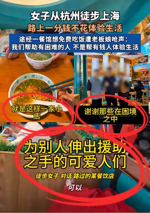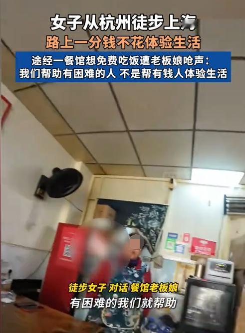 浙江杭州,一女子带弟弟从杭州徒步到上海,而且路上不能花一分钱。女子和弟弟在途中感到饥饿难忍,于是向一位饭店老板要点吃的。然而当饭店老板知道女子只是带弟弟体验生活后,说了一句话,女子转身就走。(来源:经视直播) 据女子的个人社交账号显示,她是一家餐饮店的负责人。至于她带着弟弟徒步至上海,还不花一分钱的理由并不清楚,可能是为了让弟弟体验下生活的困难。 途中,女子带着弟弟向不少餐厅要过吃的,这些餐厅的工作人员也纷纷伸出了援手,这让女子认为这趟徒步旅程会相当轻松。 然而在事发当天下午,女子和弟弟路过一个地方时,感到又累又饿,于是向一家餐厅的老板娘要点吃食。 老板娘看女子和弟弟穿着干净的羽绒服,背着干净的背包,怎么看都不像是生活困难的样子,所以并没有立即答应。女子可能也察觉出老板娘的疑虑,于是主动交待了自己是带弟弟体验不花钱的生活。 老板娘忍不住回了一句:“你们这些有钱人还来体验生活?连饭钱都舍不得给?” 女子立即摆手解释:“不是舍不得给钱,是不让花钱,这是一堂体验课!” 老板娘觉得女子的解释没有任何说服力,于是回了句:“我们是帮那些真正有困难的人,实在没饭吃的人,不是你们这种有钱人来体验生活的。有困难我们才会帮助!” 话到这份上,女子也没法厚着脸皮继续说了,只能尴尬地走出了饭店。 由于当时天色已晚,女子和弟弟还没有住的地方,于是她和弟弟拦下了一位路人大姐,询问其是否能提供吃的。这位路人大姐连连摆手,因为不知道女子和弟弟的真实意图。 事后女子将视频发到社交媒体上,将这一路的经历如实地展现了出来。 有网友表示,女子带弟弟体验生活的行为值得赞扬,也为途中愿意提供帮助的餐厅点赞,社会就需要这样的正能量。 但也有网友表示,老板娘没有说错,免费的饭食只能提供给真正有需要的人,而不是来体验生活的人,女子完全可以在老板娘那边刷盘子做服务员来挣这顿饭的钱,而不是什么都不干就开口要吃饭。 助人为乐一直都是我国的优良传统美德,对于有困难的人群,我们应当尽可能的给予帮助。但女子本身并不是穷人,她只是带着弟弟来体验不花钱的生活。 天下没有免费的午餐,如果女子和弟弟要吃饭,完全可以选择以工代酬的方式,换取这顿饭食。否则都像女子这样体验生活,那还不乱套了。 《民法典》第5条明确规定,民事主体从事民事活动,应当遵循自愿原则,按照自己的意思设立、变更、终止民事法律关系。 女子向老板娘要求施舍点饭食,那老板娘也有权拒绝,不能因为女子在拍视频,老板娘就必须同意,而且不同意就要遭受网暴,这就是道德绑架。老板娘愿意帮助女子,这是情分,不是本分。 最后,老板娘的话虽然直接了一点,但说得在理通透,善意是珍贵的,不能被“体验”当成了游戏。 对此,您怎么看?欢迎留言交流。