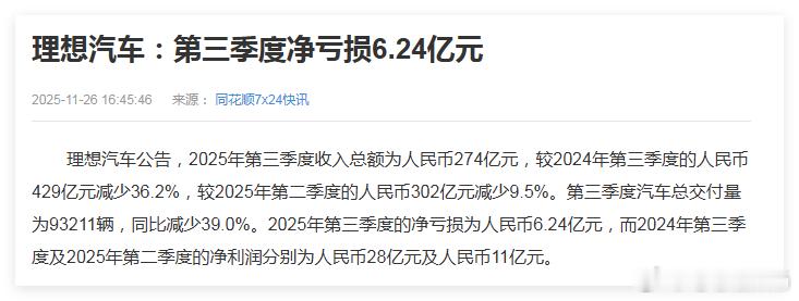 理想汽车发布25年Q3财报 万众期待的理想汽车2025年第三季度财报终于发了!1、3季度营收274亿元,前三季度营收835亿元,在新势力车企中保持领先。部分网友觉得理想不健康了,结果还是新势力领先!这就挺好!2、3季度研发费用30亿元,全年研发投入预计120亿元,涉及到芯片、基座模型、底层操作系统等,其中AI领域投入超60亿元。账上有钱,完全可以拿出大把现金投入研发,这就是有钱任性!3、两款新车理想i8和理想i6累计订单突破10万台,理想MEGA获得三季度高端纯电市场销量冠军。目前来看,i系列卖的真的还可以,符合预期超出预期!4、截止三季度末,现金储备达到989亿元!989亿元!这账上钱没咋花啊,其实还是挣得够多,那赶紧加快建充电站、加快产品更新迭代!5、全球化占率加速,2025年完成中东、中亚以及北非核心区域初步布局,2026 年按计划逐步拓展拉丁美洲、欧洲以及东南亚市场。走出国门才是重点工作!理想汽车 理想汽车Q3财报