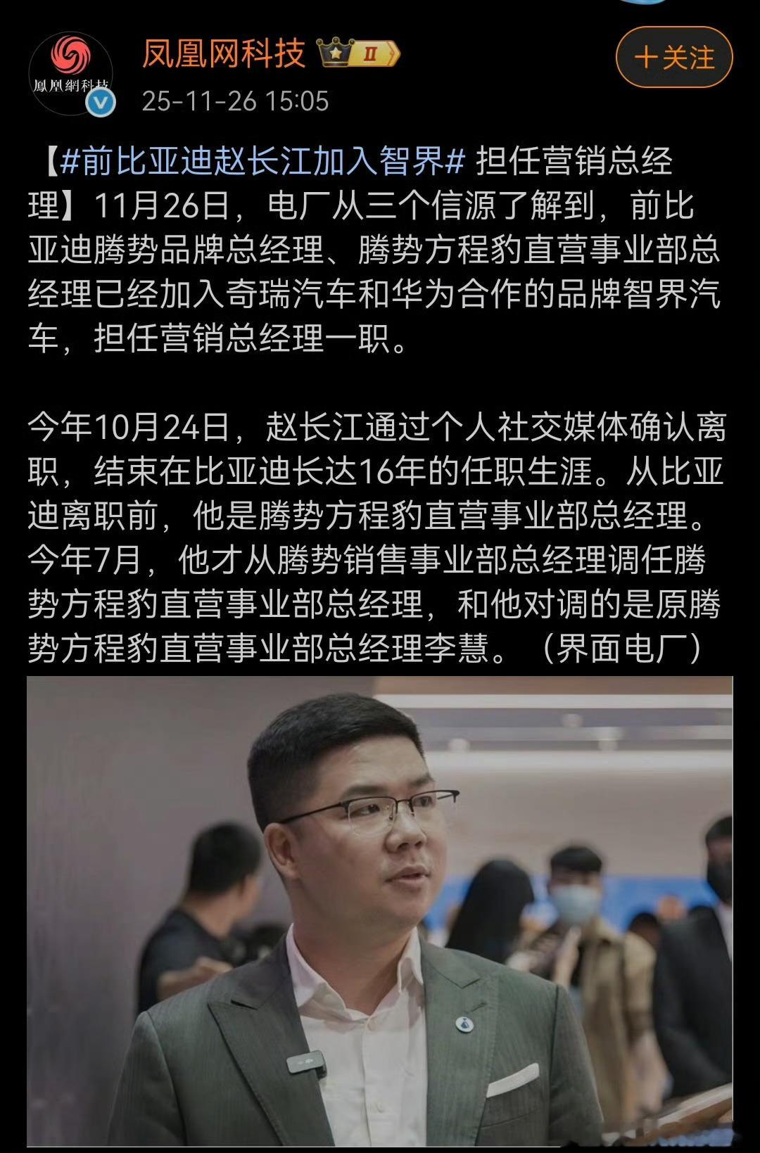 【赵长江回应入职传闻】赵长江称还在休息中11月26日11月26日,网传前腾势总