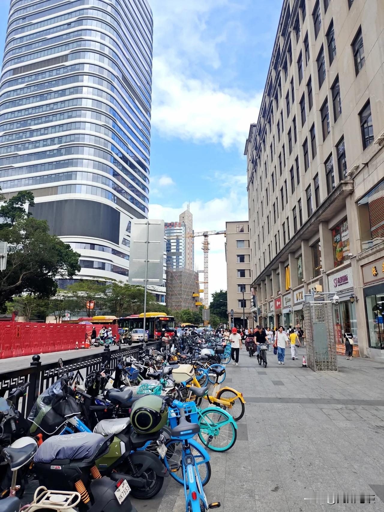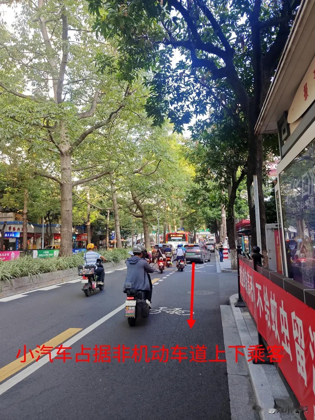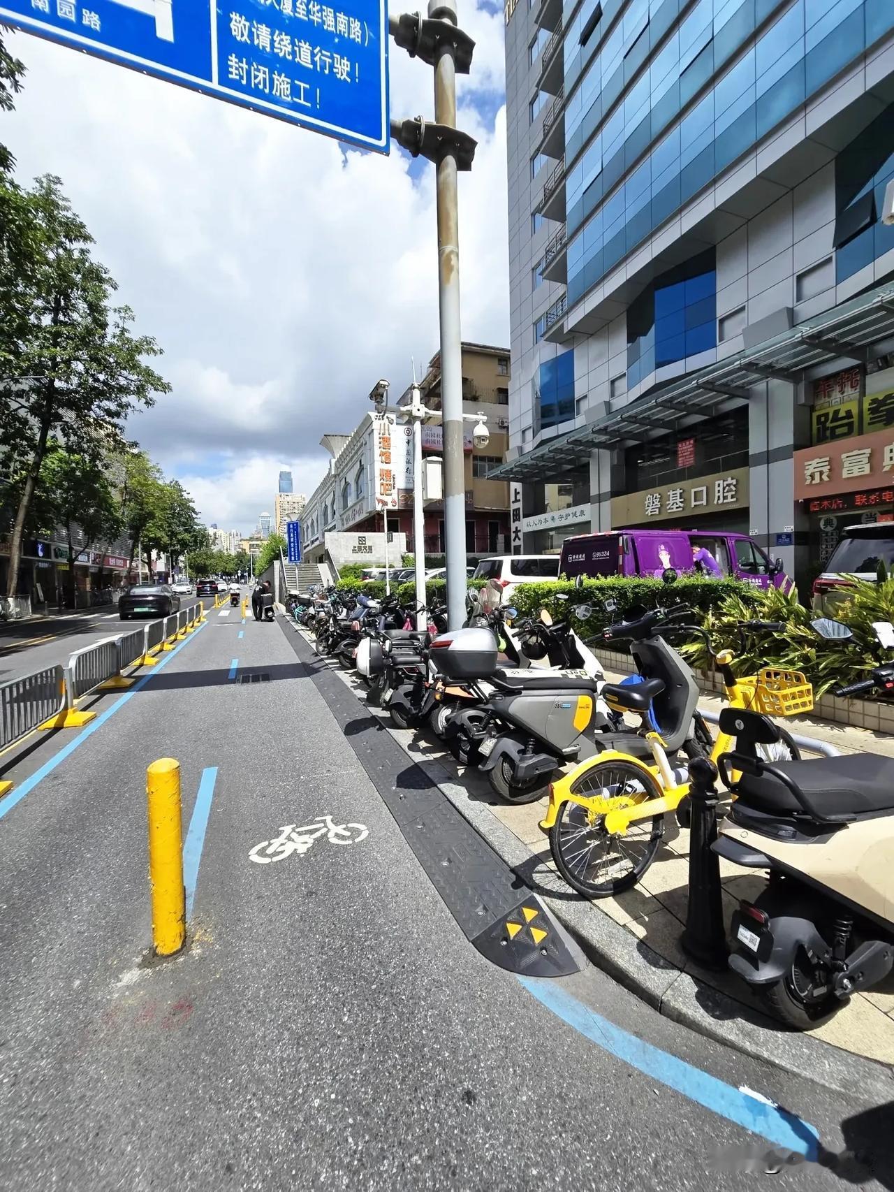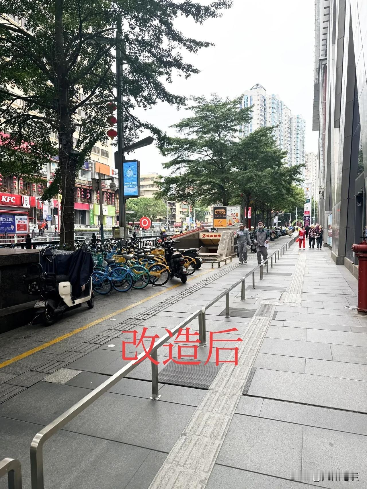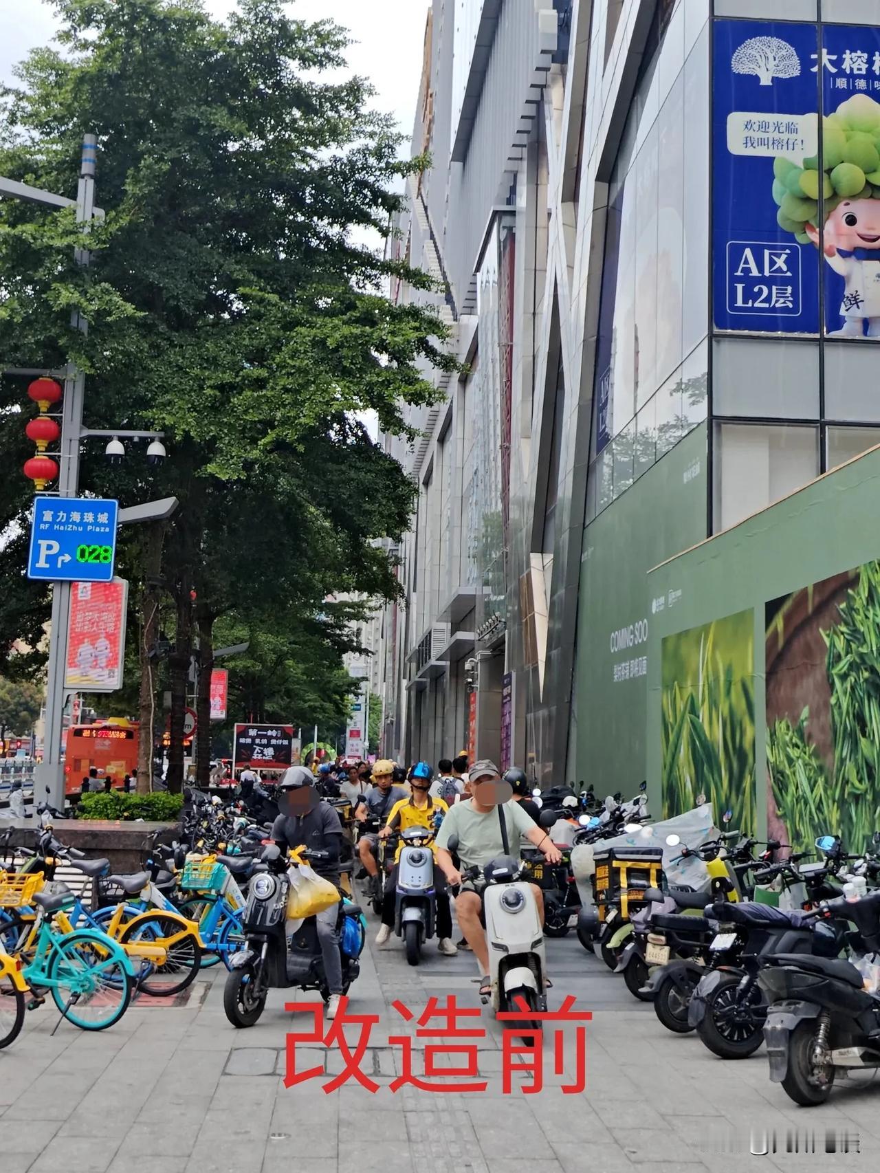 【平衡之道】让700万两轮车制衡400万汽四轮车,广州行人、非机动车、机动车三赢的局面来了! 隔壁深圳部分地区已经改造完成,电鸡与行人互不干扰!如图一、二。 ♥️具体方案就是: 人行道停放非机动车的方式180度掉头! 让电动自行车等非机动车从非机动车道上人行道,车头超向人行道停放,车辆停放不经过人行道出入口,实现行人与电鸡的物理隔离。 现在的人行道也不需要专门改造非机动车上下坡度,只需要增加一个橡胶斜坡就可以了。新建和改建道路才需要专门设置好上下坡度。 实际上,外卖骑手,以及其他骑两轮车的,也不愿意走人行道,奈何要取餐等,餐厅在中间位置,人行道与非机动车道之间又有高高的隔离栏,只能从路口上人行道骑行,推行又不现实,在我们国家,干啥的个个都要赶时间。 但如果改造成深圳那种方式,就可以不用上人行道了。从非机动车道上人行道停车后,就可以直接跨过低矮的护栏,进入餐厅或者大楼里面做自己的事了。 同时,非机动车需要从人行道上下,也阻止了四个轮子的汽车长时间占用非机动车道违停的问题。如果长时间停放,就会影响非机动车出入。但临时停车,停个五分钟十分钟又不会受到影响,只有上下客后就可以走了。 可以说这样一举三得,行人,非机动车,汽车都有利。 图3-5,就是广州一个全国文明社区单位改造前与改造后的对比,也是进行了物理分割,这种改造成本更低。 图6-9这样的人行道也都具有改造条件。