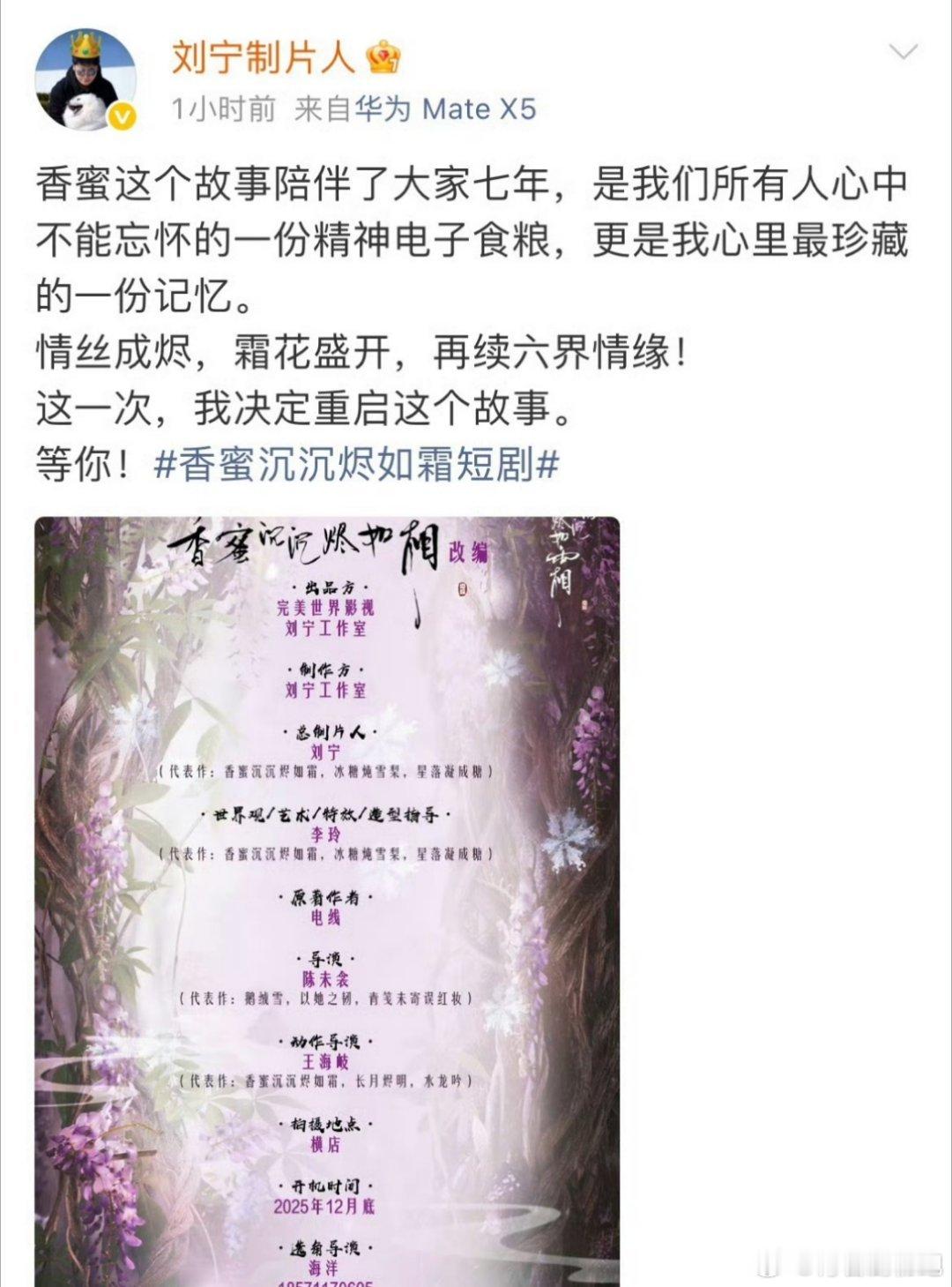 香蜜要出短剧了?!初代出品刘宁工作室坐镇,还是熟悉的品质保障,那我很期待了,也不知道短剧什么阵容,先期待一波