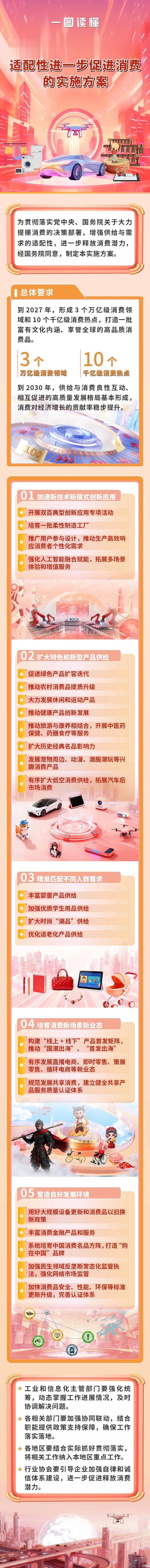 《方案》提出,到2027年,消费品供给结构明显优化,形成3个万亿级消费领域和10个千亿级消费热点,打造一批富有文化内涵、享誉全球的高品质消费品;到2030年,供给与消费良性互动、相互促进的高质量发展格局基本形成,消费对经济增长的贡献率稳步提升。