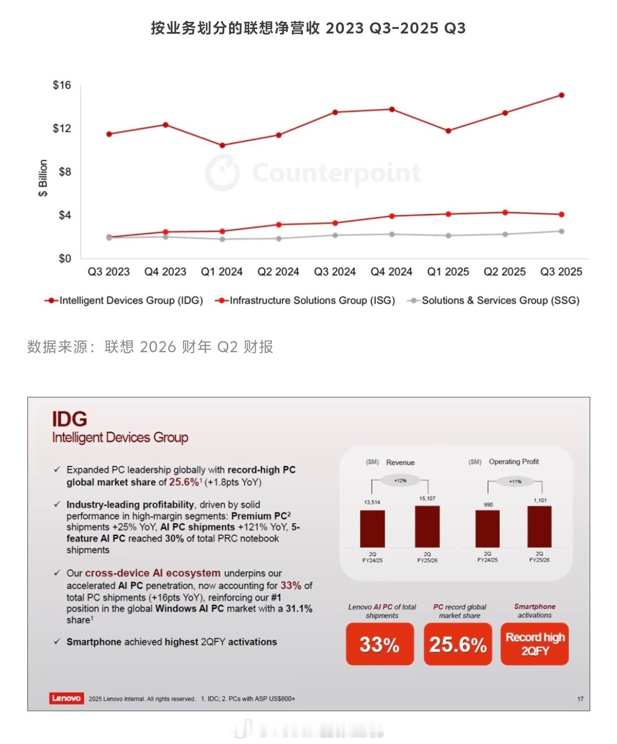 联想:你们其它公司斗着先,我闷声赚钱先。联想集团公布了 2026 财年 Q2 (对应 2025 年自然年 Q3)业绩:营收205亿美元,环比增长 9%、同比增长 15%,略高于华尔街预期的 200 亿美元。这是联想连续第八个季度同比增长。联想 2025 年 Q3 在所有地区均实现两位数同比增长。美国市场在PC和基础设施业务的推动下增长 13%,而中国市场则大幅增长 24%。目前 AI 设备占联想全球 PC 出货量的比例已由上一季度的 30% 升至 33% 以上。联想核心的智能设备业务集团(IDG,包括 PC、平板电脑、智能手机及智能设备)营收同比增长 12%,营业利润由上一季度的9.5亿美元增至 11 亿美元。公司进一步巩固了其 PC 市场领先地位:·PC 市场份额:25.6%(同比提升 1.8 个百分点)·Windows AI PC 市场份额:31.1%(高于上一季度的 30.6%)移动业务部分:连续第九个季度实现了全球高端市场占比正增长。激活量和销量都在上升—第二季度创下历史新高,这主要得益于摩托罗拉高端产品线的强劲表现(摩托罗拉的激活量同比增长 28%)。摩托罗拉高端设备目前已占移动业务总收入的 35% 以上。中国区同比增长 15%,北美小折叠份额第一,西欧市场更是拿下今年上半年整个折叠屏产品(不分大小折叠)的单品销量冠军(razr 60,razr 50 也名列单品第四),欧洲、中东和非洲地区有两位数的销量增长,印度市场出货量同比激增 50%,并成为印度第三大智能手机出口商。