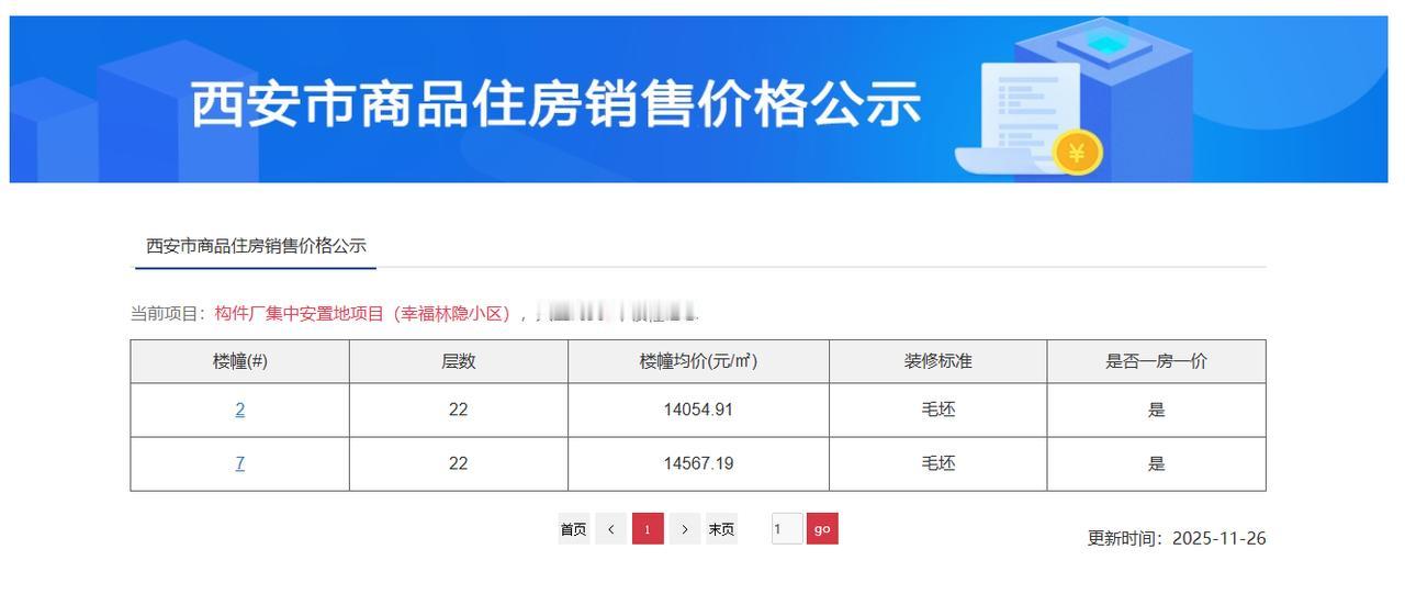 最低12396元/㎡起!刚刚,西安住建局官网公示了新城区幸福林带板块纯新盘“幸福林隐小区”首批房源的价格! 幸福林隐小区(构件厂集中安置地项目)位于西安市新城区咸宁东路与规划路交汇处,北临咸宁花园小区,西接城市规划路,东倚卫星测绘中心,南望老钢厂设计创意产业园,总用地面积约57.83亩,总建筑面积约154835平方米,容积率2.80,绿地率35%,包括6栋高层、3栋多层。 项目位于幸福林带板块,西侧紧邻西北大学第一医院(原陕西省第四人民医院),南侧是西安建筑科技大学华清学院,距离幸福林带400米,北侧不远是规划在建的后宰门小学幸福校区(分部),距离地铁6号线卫星测控中心站、地铁8号线万寿南路站均约500米左右。 项目周围还有西安市新城区后宰门小学幸福校区,西安市东方中学、咸宁百货商场、幸福西津购物广场等配套。 本次价格公示,项目是纯新盘首次入市,公示2