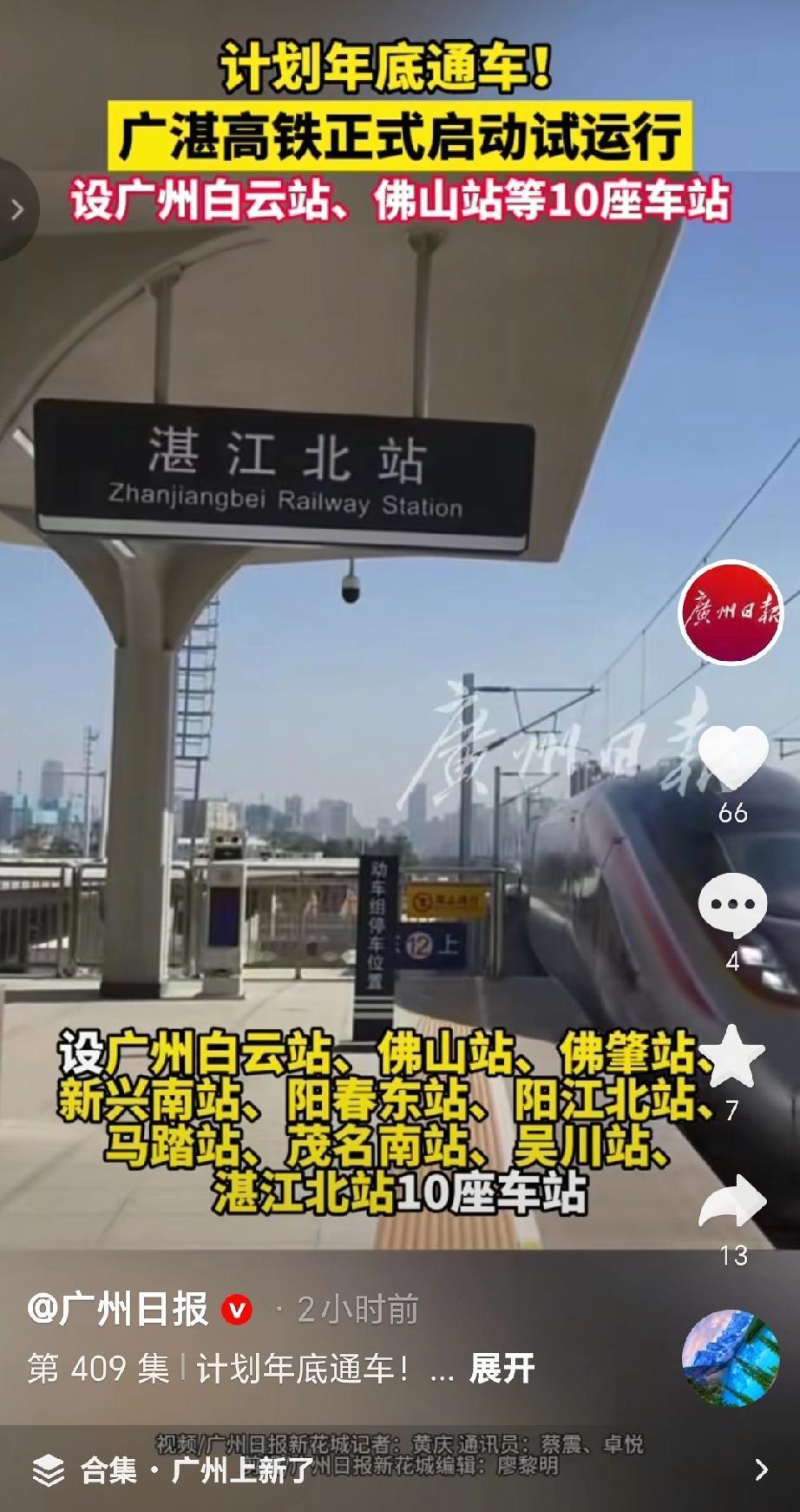 广湛高铁11月26日上午,试运行高铁列车从广州白云站开往湛江北站,标志着广湛高铁正式进入试运行阶段,线路开通运营进入倒计时模式。计行车速度350公里/小时,途经广州、佛山、肇庆、云浮、阳江、茂名、湛江等城市。按照计划,广湛高铁将于2025年底前具备通车条件。(来源于@广州日报)