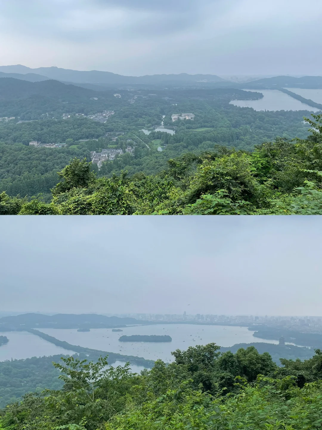 ✅九曜山,在太子湾公园内也有登山口,沿步道半小时就能到达山顶,看到山顶的九曜阁时,整个西湖也就顺势展现在眼前,可以俯瞰整个西湖,给你不一样的视角,可以在山顶喝茶🍵赏西湖,我们到达山顶时刚好在下雨,烟雨朦朦的,晴天应该会更美一些。
