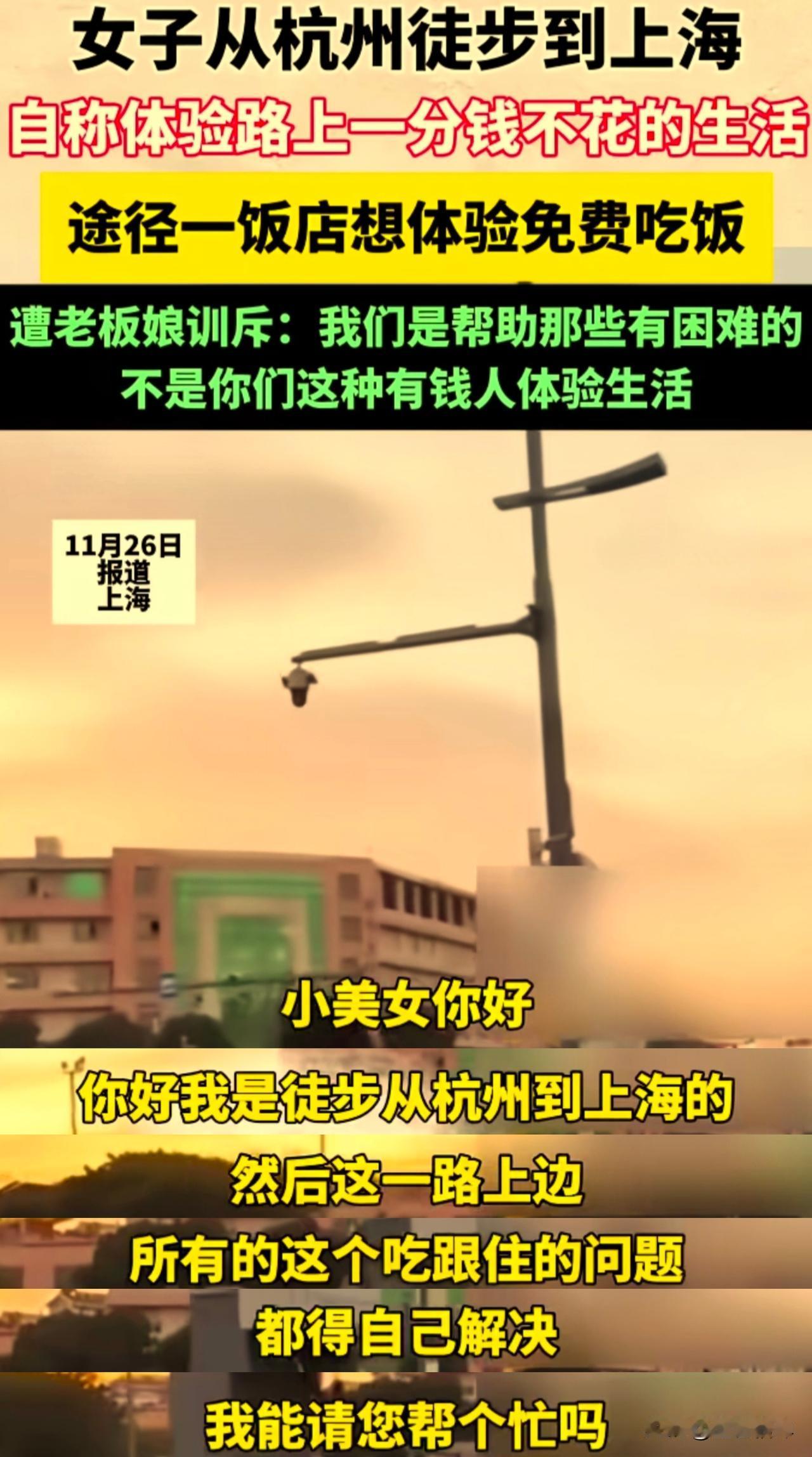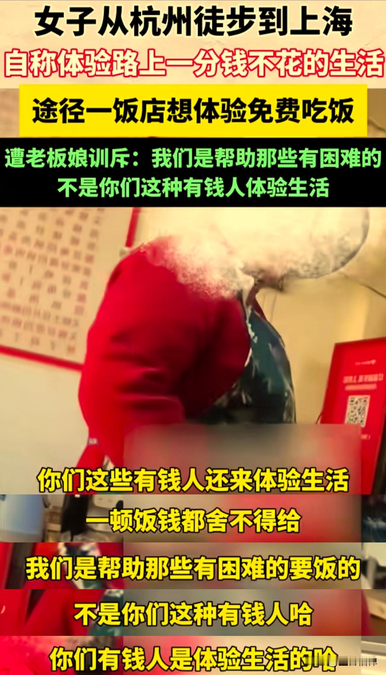 一女子从杭州徒步穷游到上海,说自己是体验路上一分不花的生活,经过一家饭店进去想体验免费吃饭,结果遭到老板娘训斥。 老板娘说你们是有钱人,出来为了体验生活,一顿饭钱也舍不得给,我们帮助的话也是帮助那些真正困难的人,他们没钱吃饭可以免费吃,不是你们这种有钱人,你们有钱人是出来体验生活的。 网友们也一致站老板娘这边,认为老板娘做的很对,免费这种资源应该给予那些真正需要的人,她的善意也是一种有限的、珍贵的资源,被一个有钱的并不真正需要的的人“骗取”或者“消费”,她也接受不了。 何况现在做生意开饭馆的人也不容易,都是需要成本的,老板娘愿意施舍帮助真正有困难的人,这是一种善良的传统美德。 真正身无分文、走投无路确实有困难的人开口求助都是小心翼翼的,而不是这种理直气壮的,老板娘也有权选择帮助的对象和方式,善意不能被滥用,信任也不能被消耗。