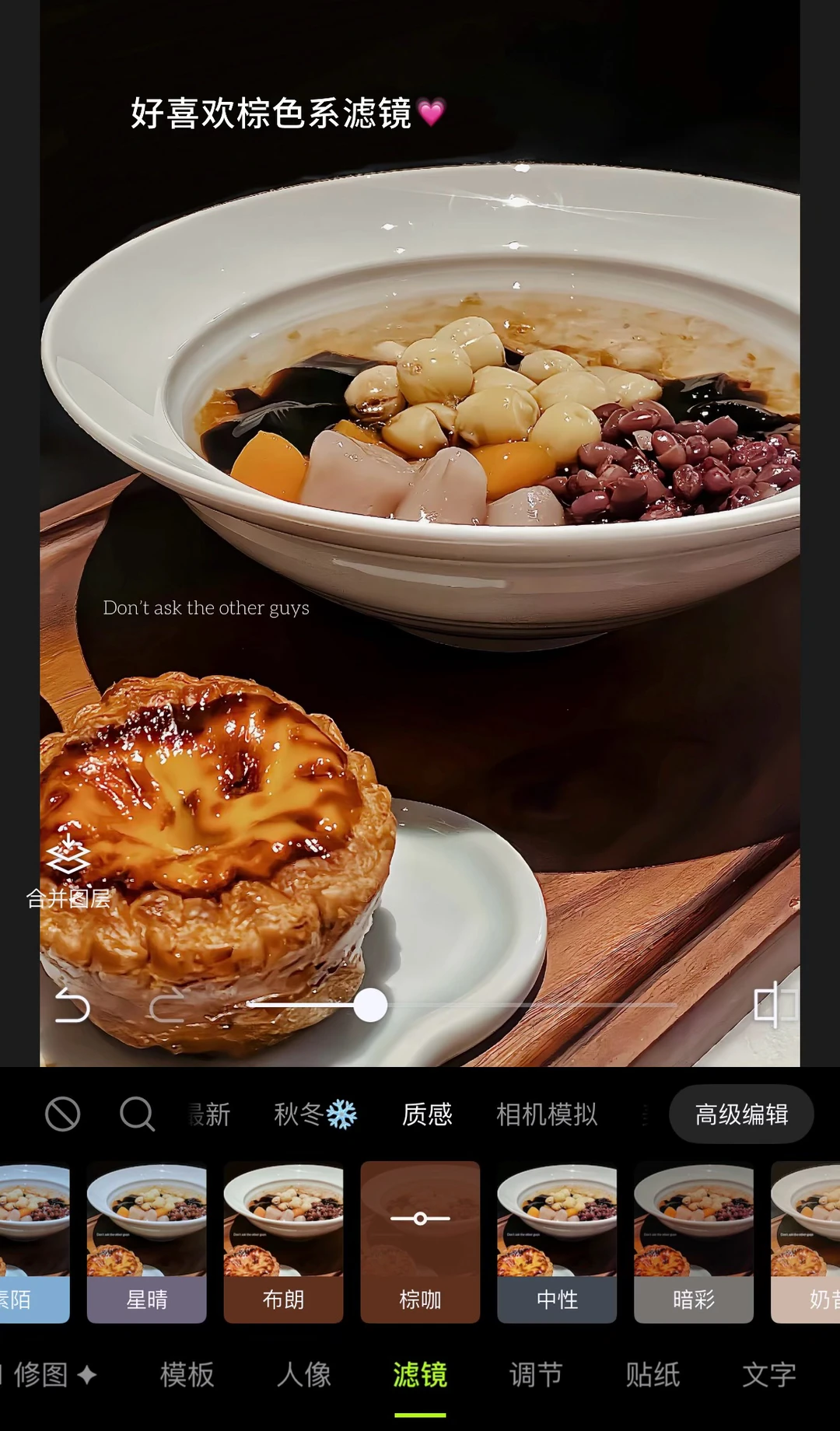 变天了真的很想喝热乎的糖水🍮 芋圆口感好好!❗️就是好甜呀~ 到底在哪可以吃到不甜的甜品[失望R] 💛拍摄:iPhone16 💛滤镜:🌟🐰 滤镜一质感一棕咖 光感+10 亮度+15 对比度+20 高光+10 色温-5 锐化+60 参数不是固定的 根据实际情况调整 大家注意数据高一点的参数即可 💛质量修复: 针对锐化过后建议用一到两次质量修复 质量修复后布丁会看起来更丝滑~ ~~~~~~~~ ❤️主页会持续更新构图和滤镜❗️