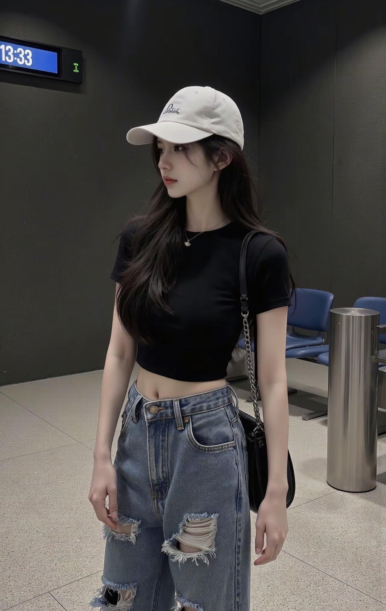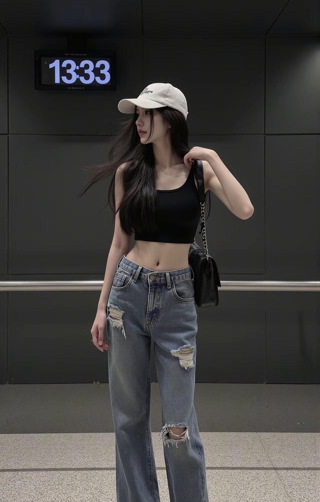 短T露一点腰,破洞牛仔兜住随性,棒球帽压下碎发