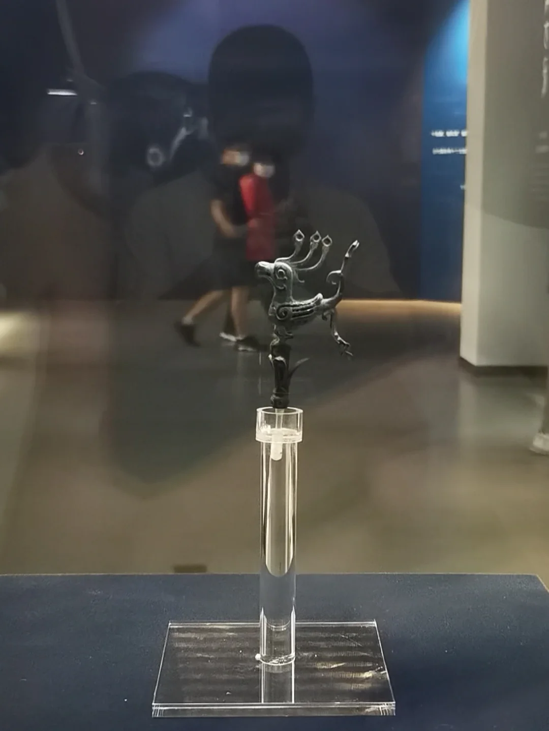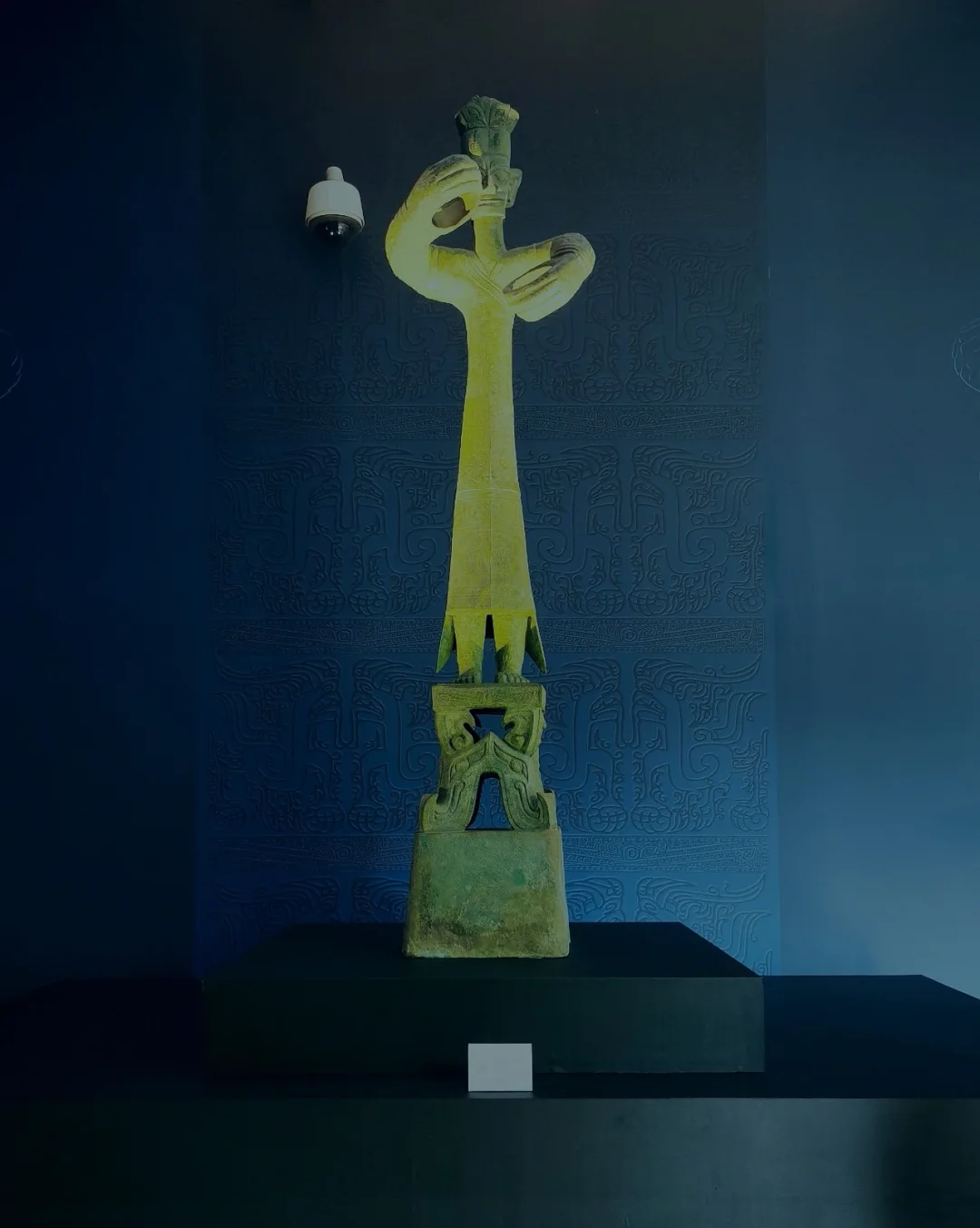 图2️⃣铜立人像:集中表现了古蜀人特定的“手崇拜”。在祭祀时挥舞着巨大的环管状双手,窥天瞅地,向臣民们传达着上天之意、神灵之意、祖宗之意。