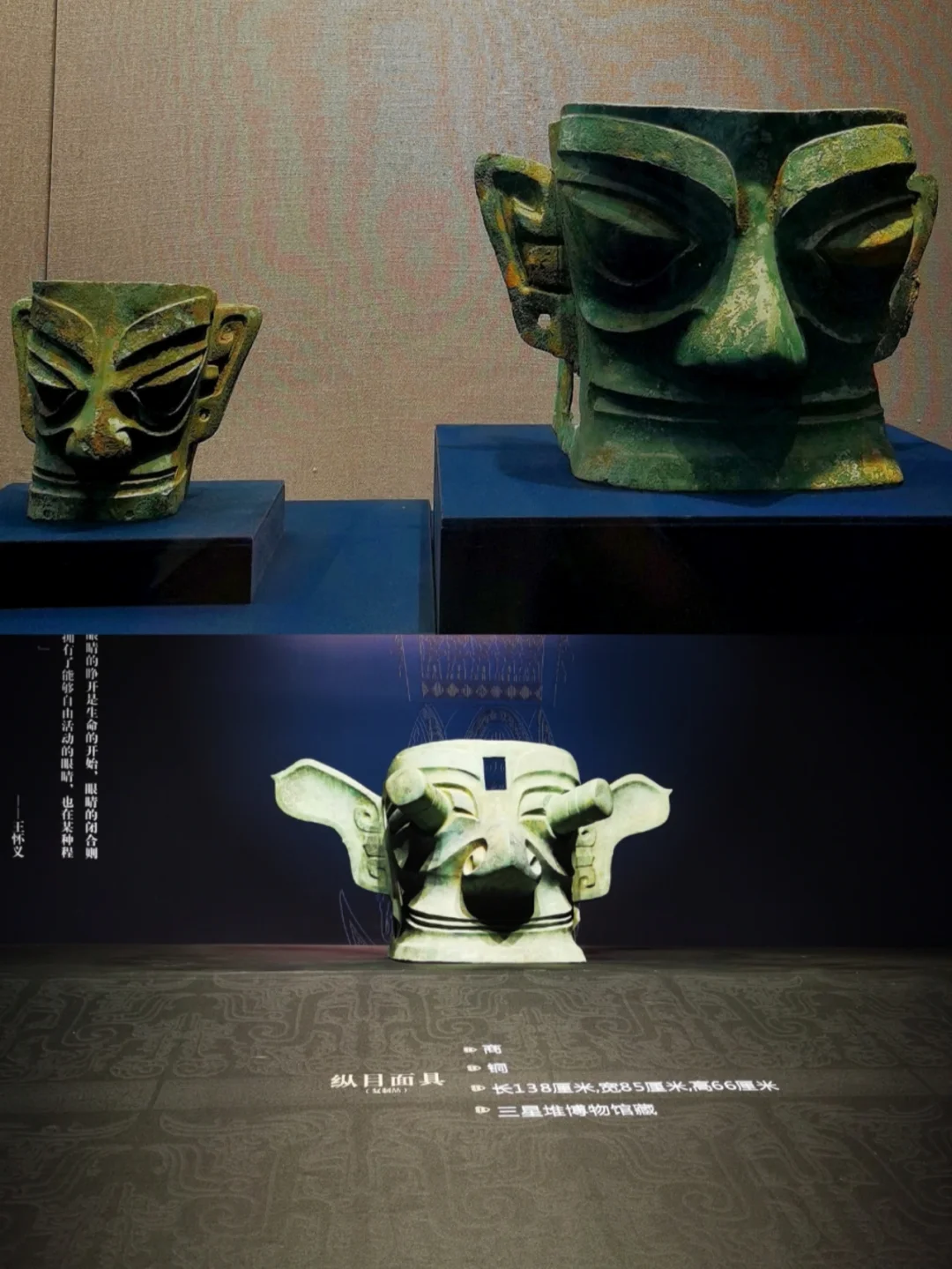 图5️⃣铜戴冠纵目面具:面具的眼睛大亦有认为“纵目”应是“竖眼”之意如中国古代神话人物二郎神额中的眼睛,其形象可能是祖先神造像。