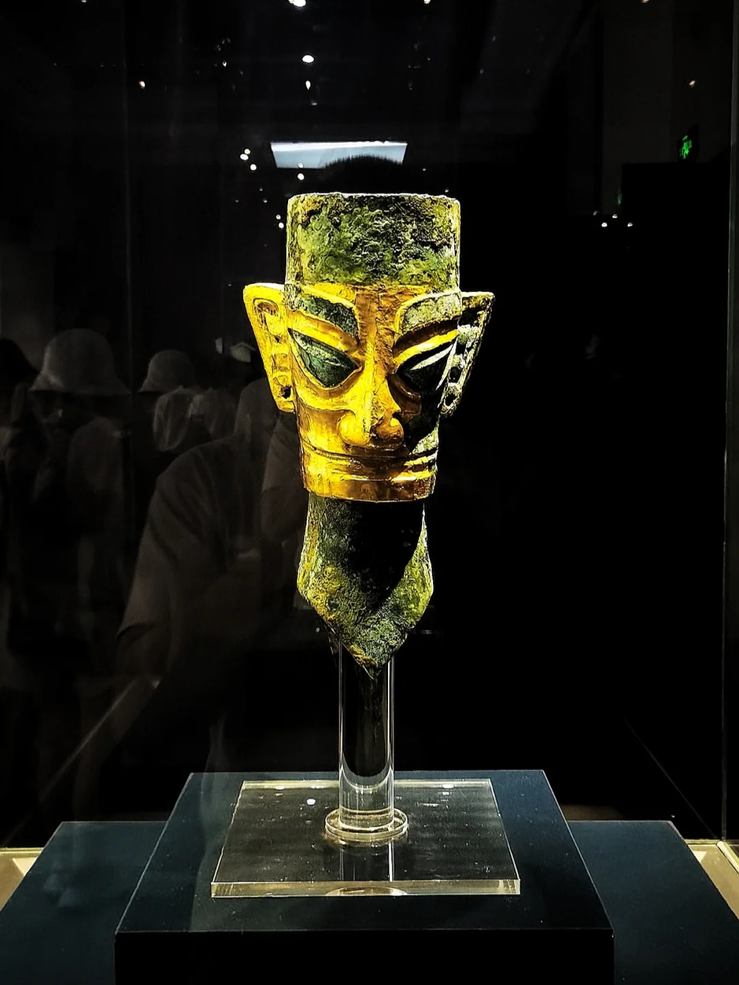 图3️⃣金面人头像:金面罩用金皮捶拓而成,给人以权威与神圣之感。这种金面造像代表社会最高层地位的人,他们手握生杀大权,并具有与神交流的特殊技能。