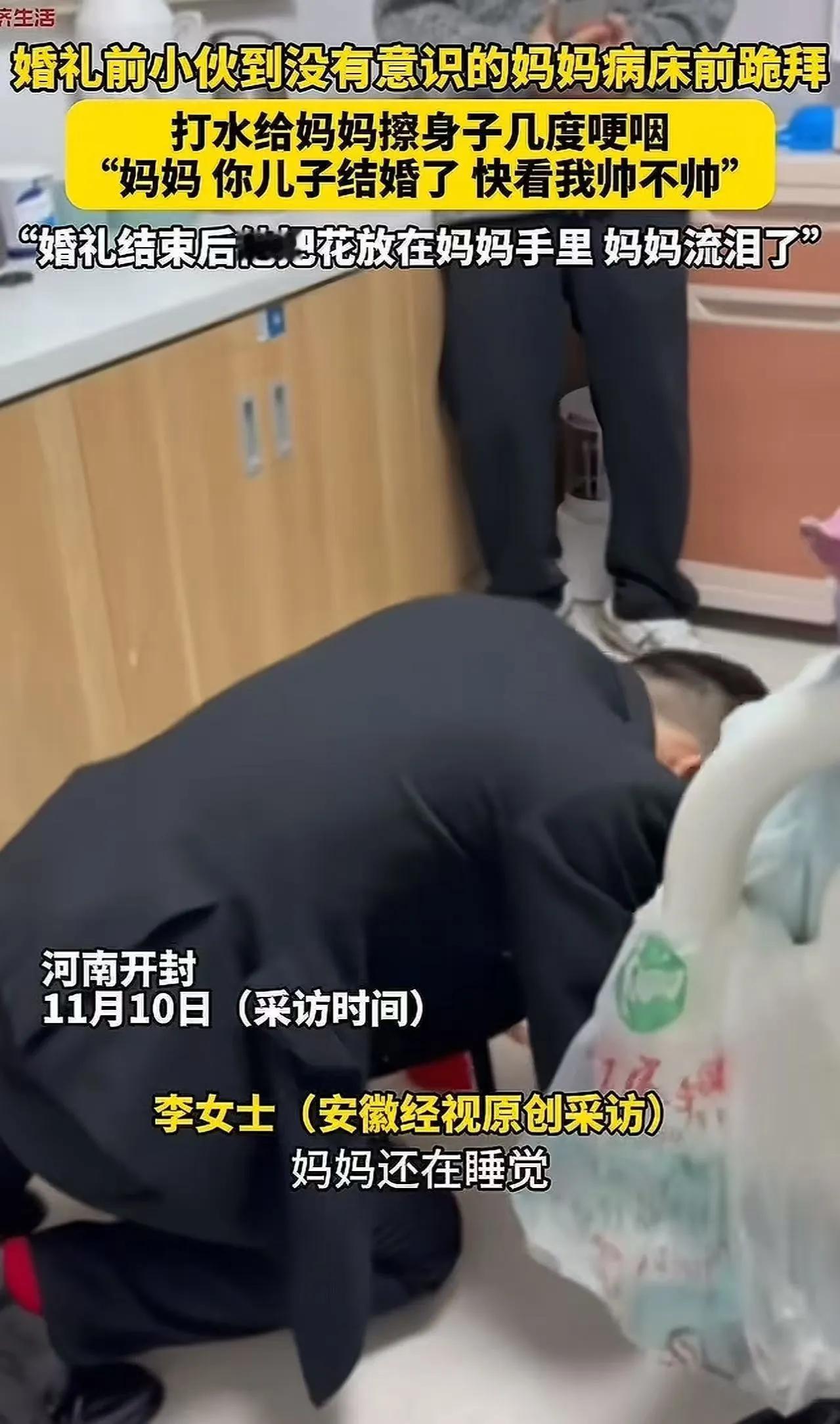 河南一个小县城的婚礼火了——不是因为排场大,也不是因为新娘美,而是因为新郎的一个“反常”举动,让无数网友红了眼眶!新郎官结婚一大早,没有急着去迎接新娘,反而先开车去了医院!对着病床上昏迷icon多年的妈妈,哽咽说道:“妈,我今天结婚啦,你不是一直盼着我结婚吗。你看看我,穿着西装帅不 这个河南小县城的婚礼之所以火爆网络,原因正是因为新郎的温情举动打动了无数人的心。当天一大早,他没有像传统那样急着迎接新娘,也没有炫耀豪华的排场,而是选择先驱车前往医院,去看望那位一直昏迷多年的母亲。 在病床前,新郎用颤抖的声音向母亲诉说着喜讯:“妈,我今天结婚啦,你不是一直盼着我结婚吗。你看看我,穿着西装帅不帅?”这一幕深深打动了现场所有人的心,也让无数网友感受到那份浓浓的亲情与孝心。 这段视频在网络上广泛传播,许多人被新郎的真情所感动,纷纷留言称:“比起繁华的排场,这样的爱更打动人心。”也有人感叹:“这样的孝顺,才是真正的幸福。” 这场婚礼成为了温暖人心的佳话,也让人们再次相信,最美的爱情不仅仅是浪漫,更是责任与孝心的体现。