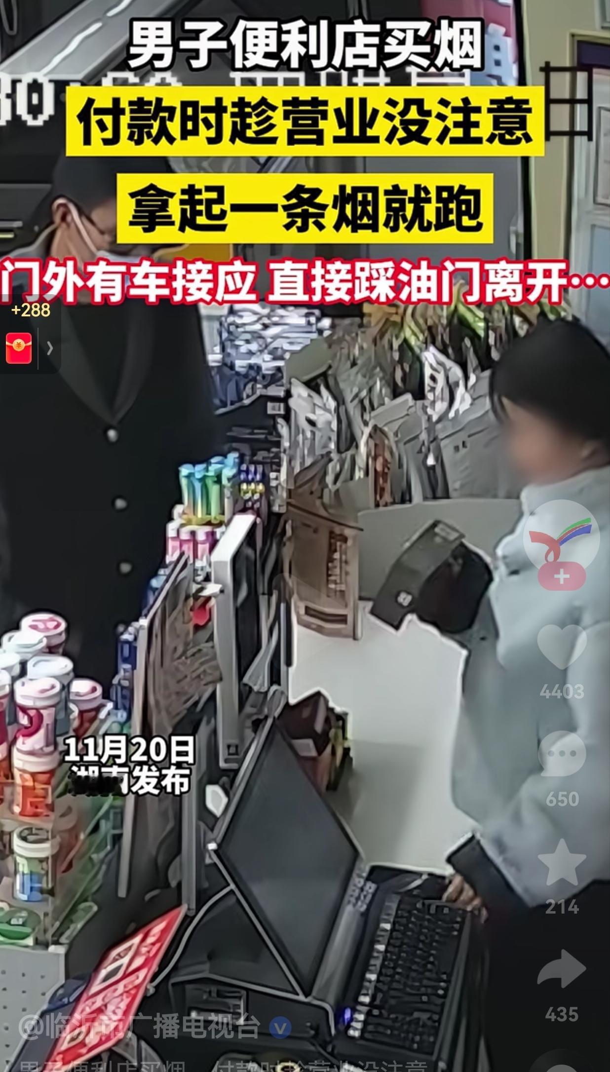 真的是穷疯了!11月20日,湖南一便利店竟然发生了令人恶心的一幕!一男子带着墨镜,戴着口罩,把自己包裹的严严实实地来便利店买烟。营业员问他要多少?他张口要了一条烟。 营业员想都没想,就把烟递给了男子。 谁知道正当付款时,男子趁营业员没有注意,拿起一条烟就往门外跑。 等营业员反应过来,就赶紧往外追。 当营业员跑到门口,直接惊呆了原来门外有一辆小汽车接应,男子趁机坐上了汽车,接应人员直接一脚油门开着车就离开了! 营业员赶紧只好返回便利店赶紧报警。 网友看到后评论说,营业员的业务水平不行,应该等着付款以后再递烟,这样就不会损失了! 还有的网友说,也是没谁了,真的是太猖狂了,为了一条烟,团伙作案,真的至于吗? 你以为你们大张旗鼓的抢劫,把自己伪装好,然后,开一个不带车牌的汽车,就没有人能找到你了吗? 现在到处都是监控,就算没有车牌号,想要锁定你的位置,找到你们俩,根本不是问题。 所以说,就算再穷,吸不起烟了也不能干违法犯罪的事情,一旦你干了这种事情,早晚会锒铛入狱的。到时候真的是“赔了夫人又折兵”了! 大家觉得呢?欢迎大家评论区讨论留言。