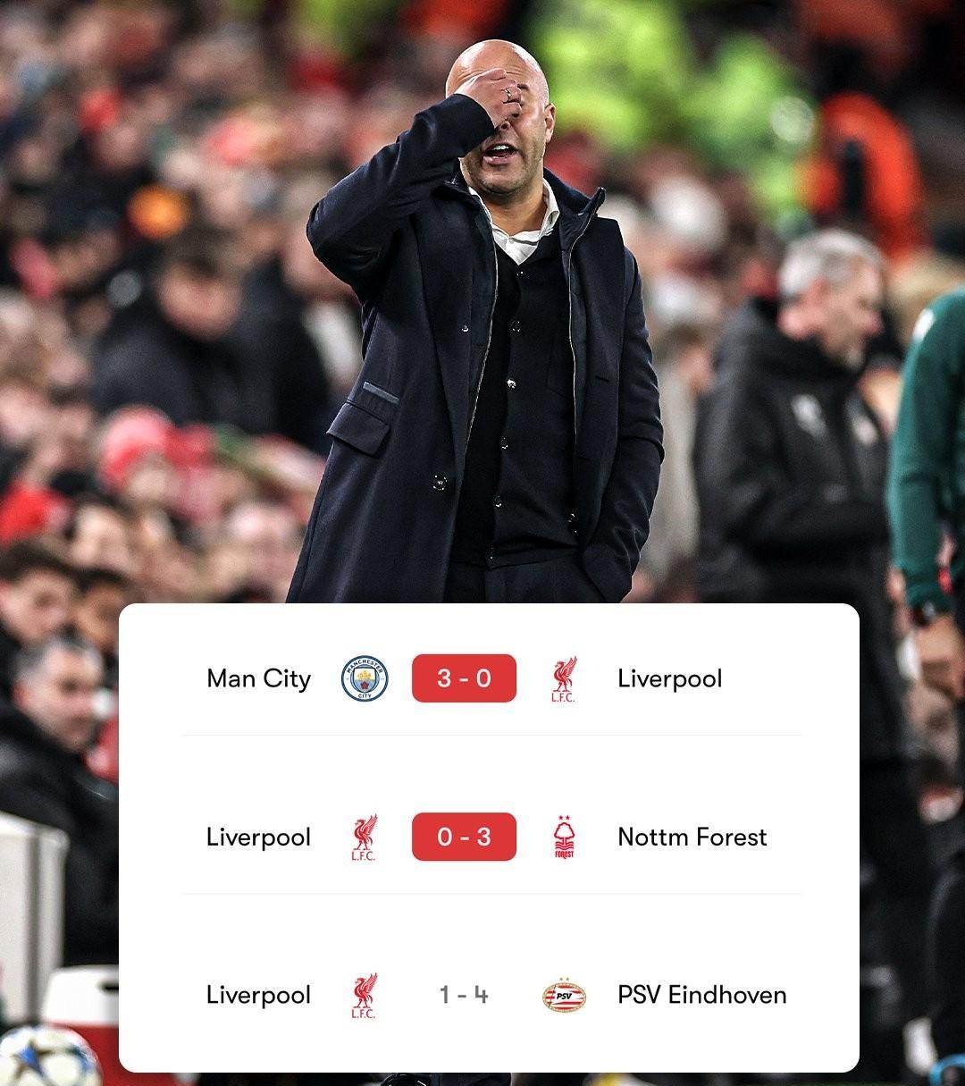利物浦这是崩盘了?自 1992 年以来首次在各项赛事中连续三场比赛丢球≥3个…… 特别是主场连续输给诺丁汉森林和埃因霍温这种水平的队伍,只能说明斯洛特已失去了对球队的控制,球员们已不想再为他卖命了。 不知道斯洛特能不能撑到圣诞节[尬笑]#利物浦#