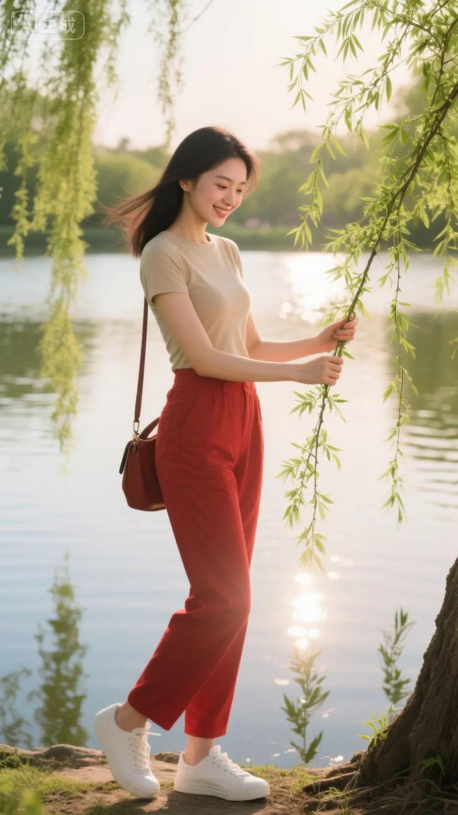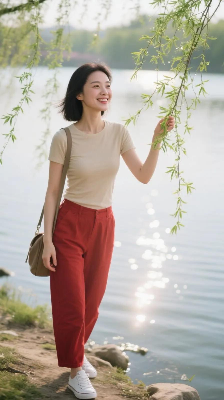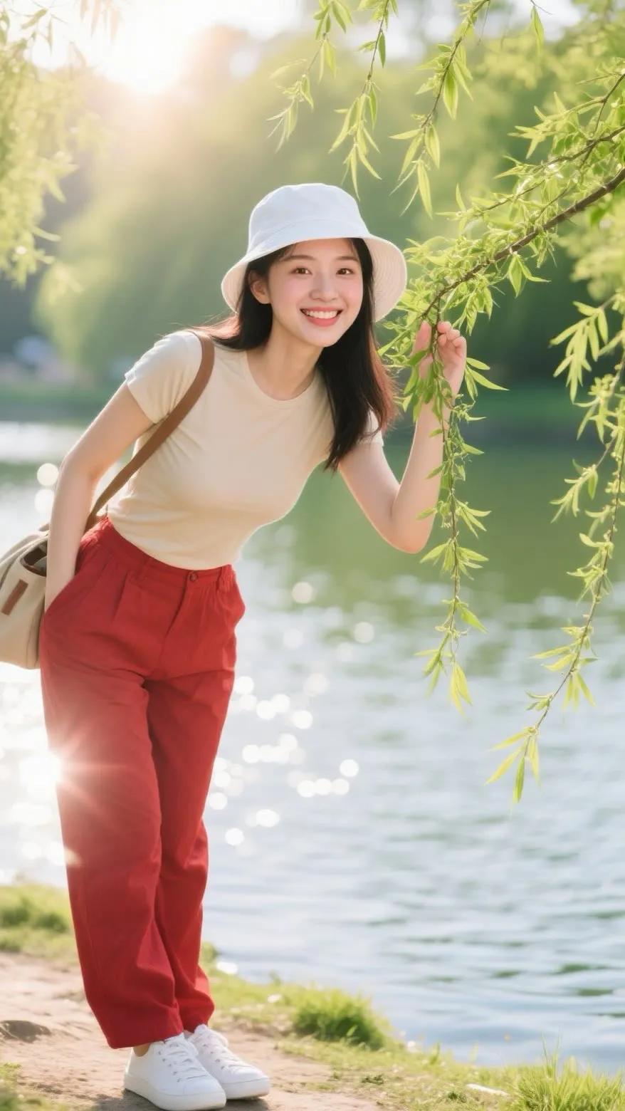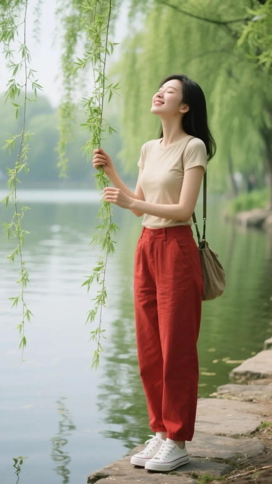 温柔微笑,绿意盎然,优雅气质,尽显自然之美。