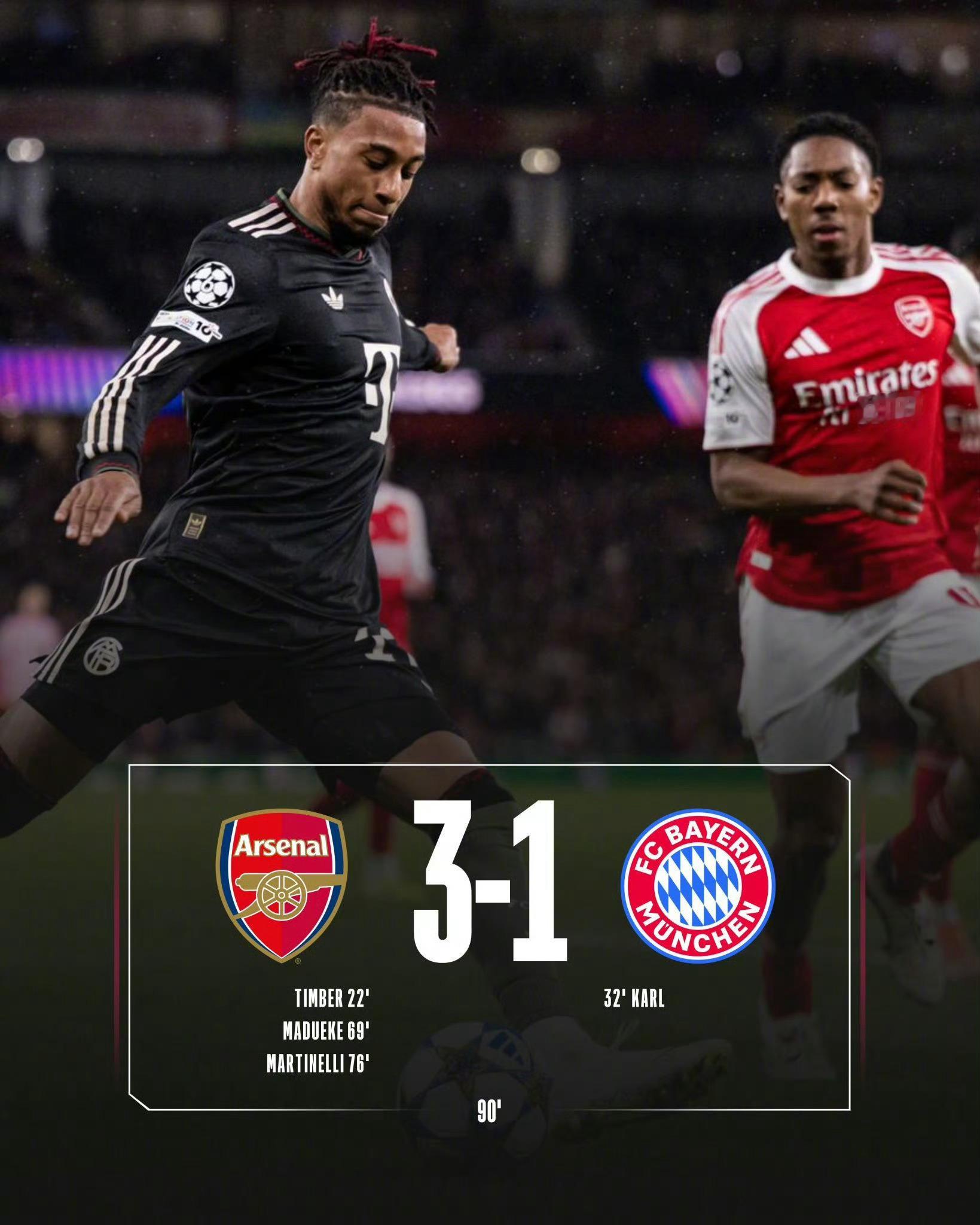 欧冠联赛阶段,阿森纳 3-1 拜仁,廷贝尔、马杜埃凯、马丁内利破门,诺伊尔送礼。阿尔特塔换人如换刀,而拜仁这边除了比绍夫,就没什么有效调整,替补和战术板确实差远了。阿森纳确实是踢的更好的一边,除了开始20分钟被拜仁压制,斯凯利防守失位问题外,基本上拜仁没什么机会,拜仁输得一也不冤,不过比赛确实精彩。欧冠阿森纳
