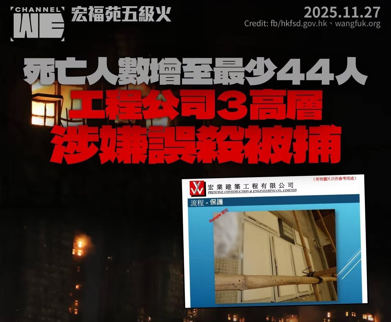 8栋楼里有一栋外墙刚燃起来就被扑灭了,勘测人员得以到现场发现更多问题。 初步调查结论出来,施工方责任逃不掉了。 建筑物外墙部分物料被怀疑不符合防火标准,电梯大堂窗外有易燃的发泡胶包封。 工程单位的两董事和一位工程顾问被带走。 更令人心痛的是这场大火其实原本可以避免。 在去年十月份的宏福苑居民交流群里,发过一个回复居民质疑施工现场存在安全隐患的帖子。 有居民曾在2024年9月分两次给劳工处打电话,反映问题,得到的回复是符合安全条例,有灭火设施,会提醒承建商。