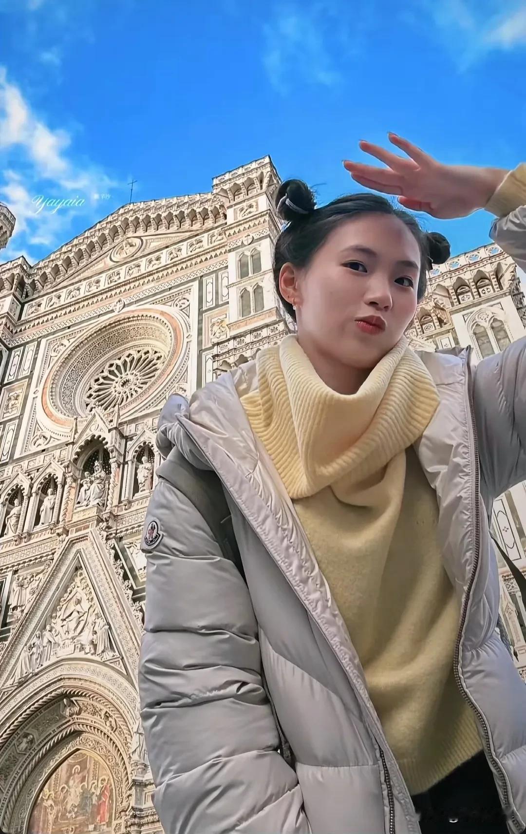 世界冠军陈芋汐现身意大利度假,她穿着米黄色高领毛衣,银色羽绒服,扎着双丸子头,个