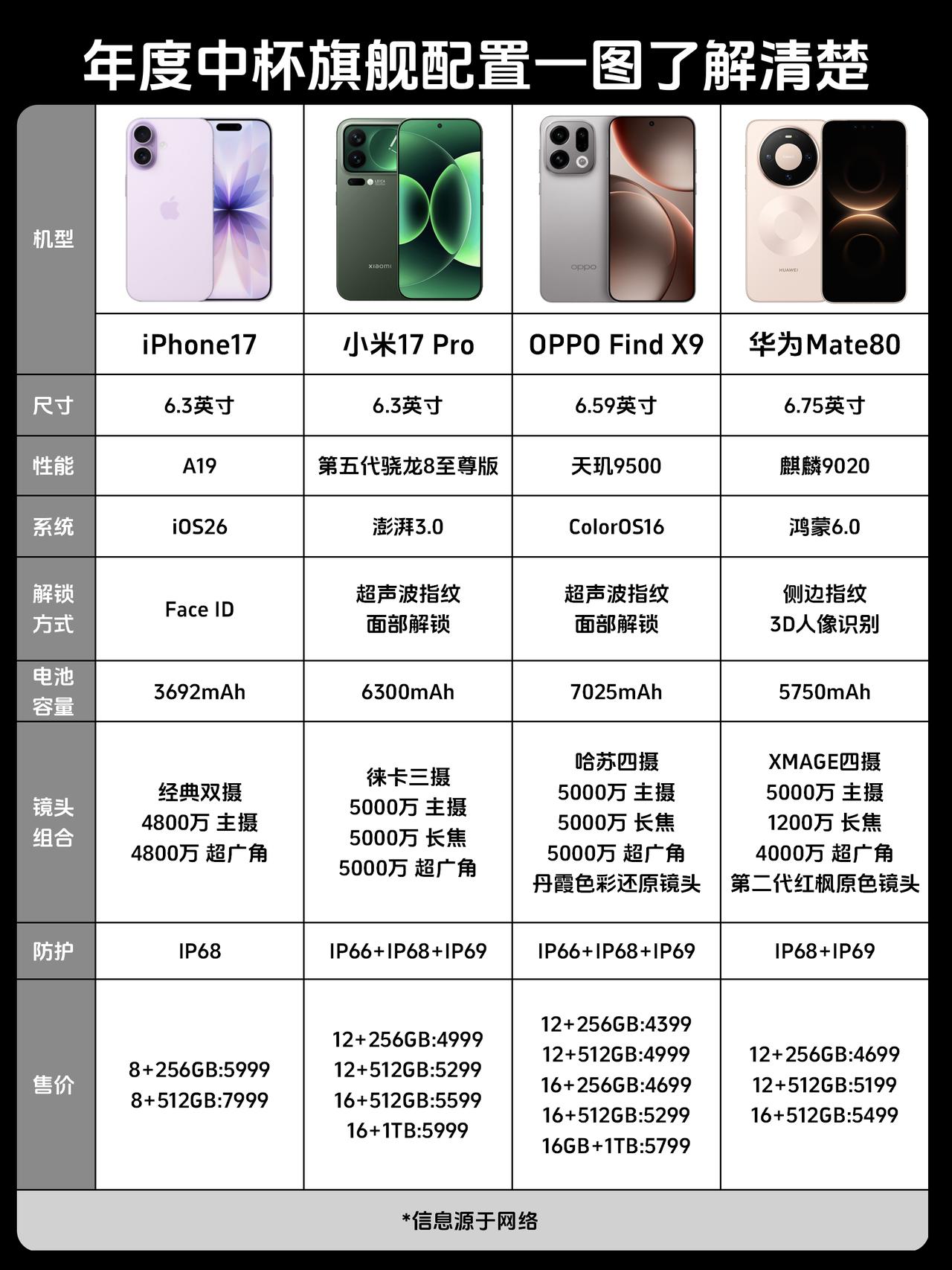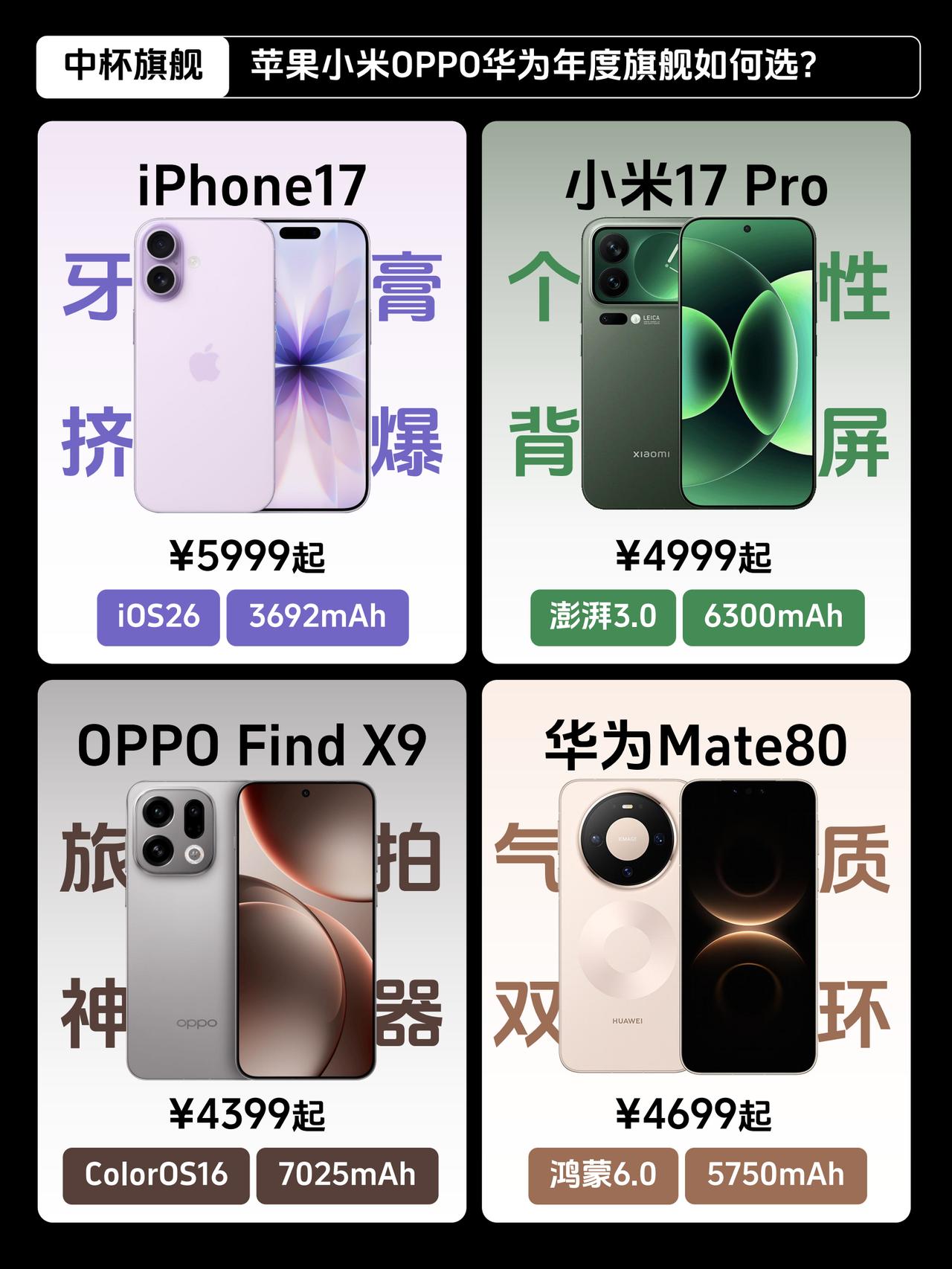 年底中杯旗舰大乱斗,你的菜是哪台? 🤔这阵子好多朋友让我推荐手机 发现大家越来越偏爱「中杯旗舰」 手感配置都到位,价格也更友好 正好华为Mate80刚发布 这就把目前最热的四款中杯旗舰👉iPhone 17、小米17 Pro、OPPO Find X9、华为Mate 80拉出来聊聊,准备换机的宝贝们速来围观👆 📱iPhone 17: iOS 26系统体验流畅,A19芯片性能稳 这回拍人像还加了珠光美颜模式,很适合果粉 💰5999起步 📱小米17 Pro: 搭载第五代骁龙8至尊版+澎湃OS3,性能挺不错的 手机的背屏设计可玩性很高,还能后置自拍预览 拍照也有徕卡加持,续航也不错,电池都上6300mAh,综合实力不错 💰4999起步 📱OPPO Find X9: 天玑9500+ColorOS16,流畅度拉满了,各种AI功能很实用 📷影像上有哈苏四摄+丹霞色彩还原镜头,人像出片更自然有气血 而且支持8K超清照片、4k live实况,拍照更清晰、还能原画质直发小🍠 续航上还有7500mAh大电池,带出去旅游拍一天都扛得住,相当给力,是续航和拍照的务实派 💰4399起步 📱华为Mate80: 新鲜出炉的新手机,搭载麒麟9020+鸿蒙6.0 性能很能打,系统流畅度也不错 升级了第二代红枫原色影像,跟Find X9一样都是色彩镜头 还原色彩和光影质感,拍景拍人色彩都更自然,还蛮加分的 续航这块是5750mAh电池,算是中规中矩 💰4699起步 这四款中杯旗舰各有优势,配置都很有诚意 年底换机你会Pick谁?评论区聊聊呗👇 数码爱好者小米iPhone华为OPPO Find X9
