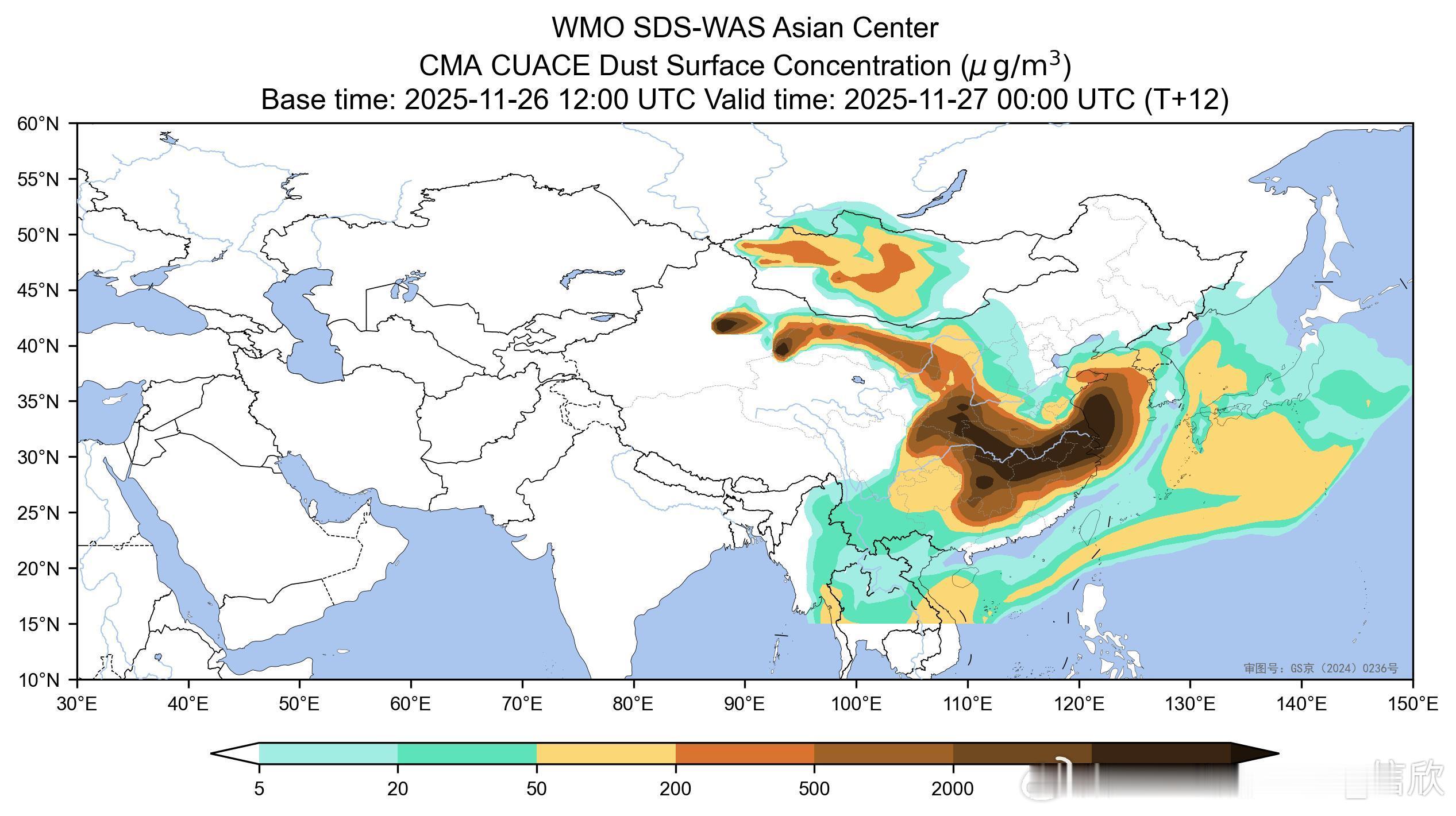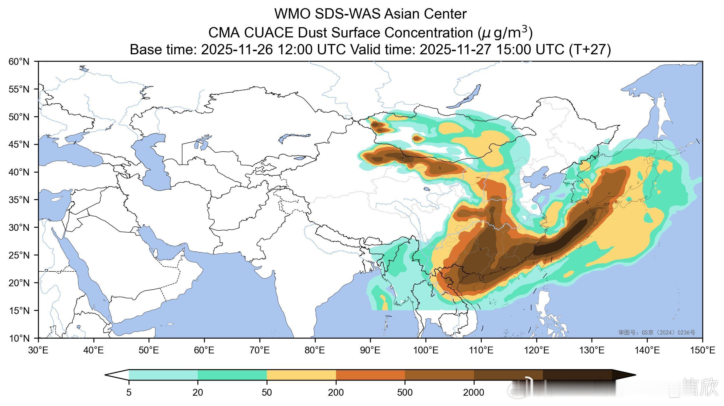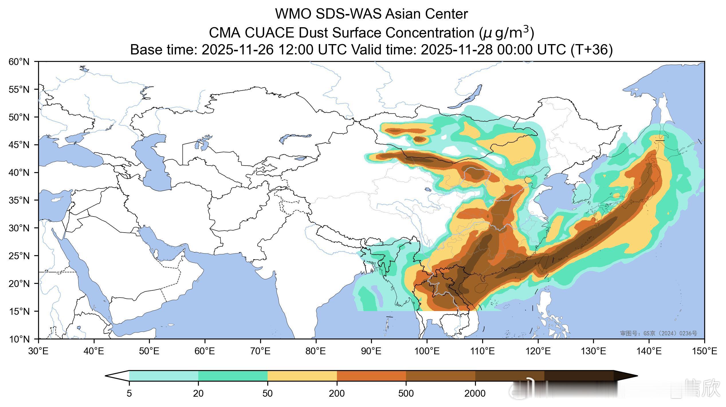 下图为数值预报模拟的27日08时-28日08时,沙尘南下情况。需要强调的是,数值预报的沙尘浓度比实际高出了大约10倍。而且模拟今天8时的沙尘南界也相对偏南。但沙尘南下的趋势可以参考。这次沙尘有可能波及到华南,导致PM10浓度上升。远距离输送来的沙尘都是相对细小的颗粒,到华南时,看起来可能更像霾。