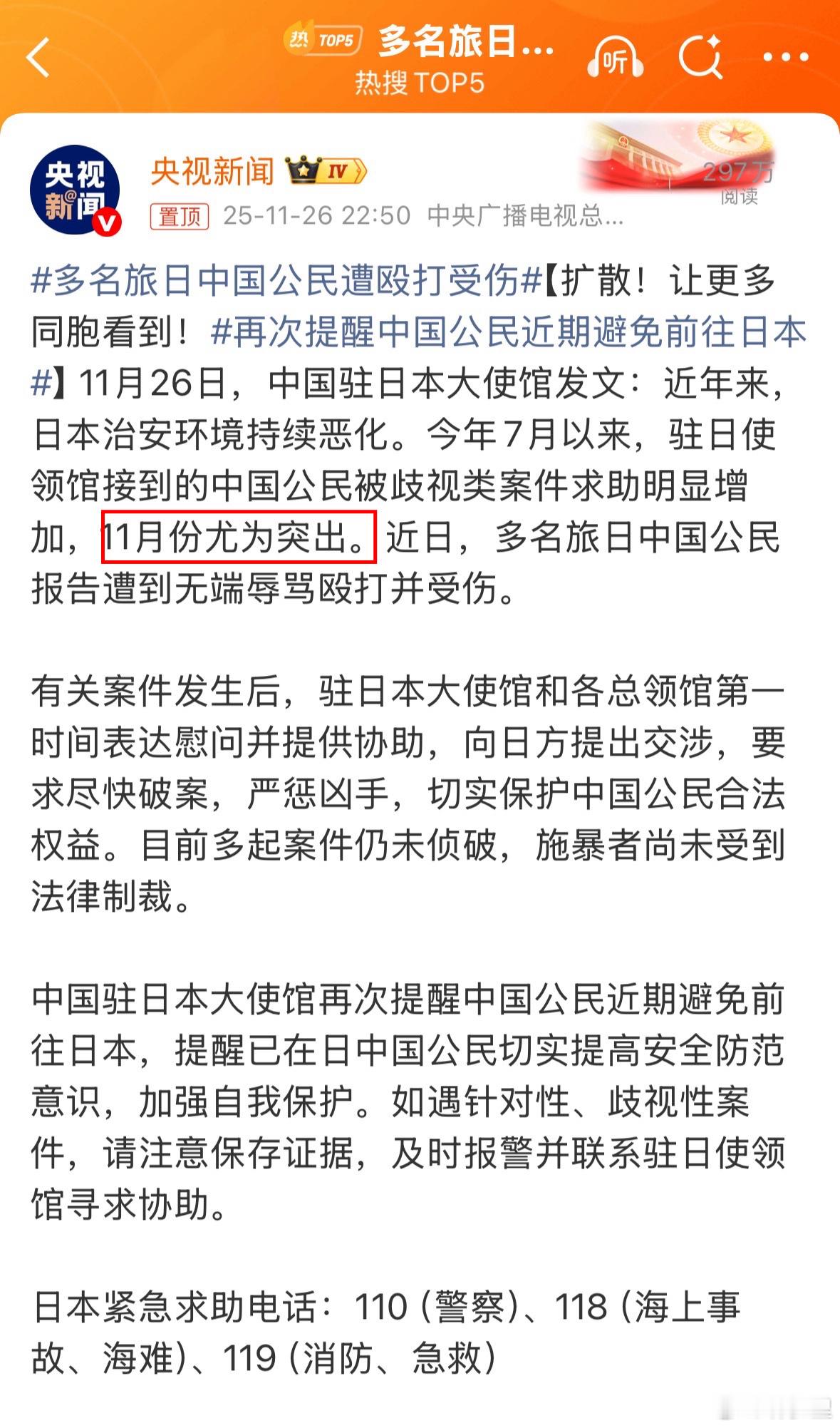 多名旅日中国公民遭殴打受伤关键词:11月份尤为突出。这是刚去日本,就被打了?都说了避免去日本,都提醒多少次,除了公务需要,这日本有什么是在紧张时期非去不可的必要?你爱日本,日本爱你吗?再次提醒中国公民近期避免前往日本