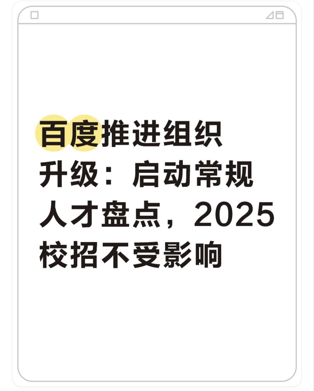 【百度推进组织升级:启动常规人才盘点,2025校招不受影响】 年终将至,互联网大厂的人才盘点工作如期展开。这一每年例行的人力资源评估机制近期在社交媒体上引发讨论,其本质是企业优化内部人才结构的常规管理行为。 百度此轮调整包含两个重要维度:一方面,公司将资源向AI核心业务进一步聚焦,提升人才密度;另一方面,持续推进干部年轻化,重用创新技术人才。据了解,这些举措均与2025年校招生无关。 当前,AI技术正从模型竞争迈向应用落地关键阶段。百度通过组织升级与人才盘点,持续加大对高潜力AI业务的投入。此举有望使百度以更敏捷的架构、更聚焦的资源配置,应对AI产业化浪潮,巩固技术领先性与市场应变能力。 在智能变革不断深化的当下,企业的组织活力与人才结构将直接影响战略执行力。百度此番调整,展现出以组织迭代驱动业务突破的明确意图,也反映出其对AI战略的持续加码。