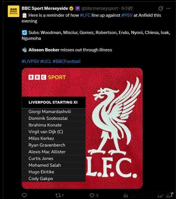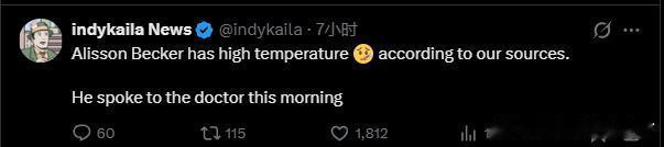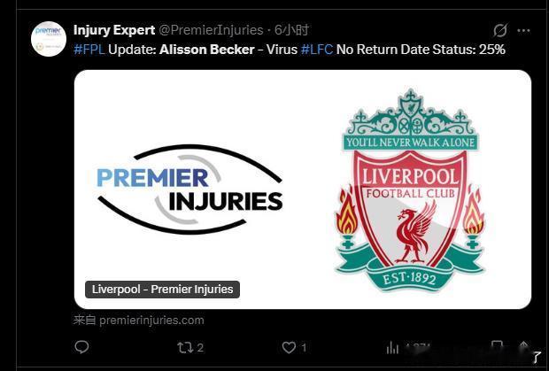 绿帽哥和伤病推表示阿里森是发烧,缺席对阵埃因霍温的比赛