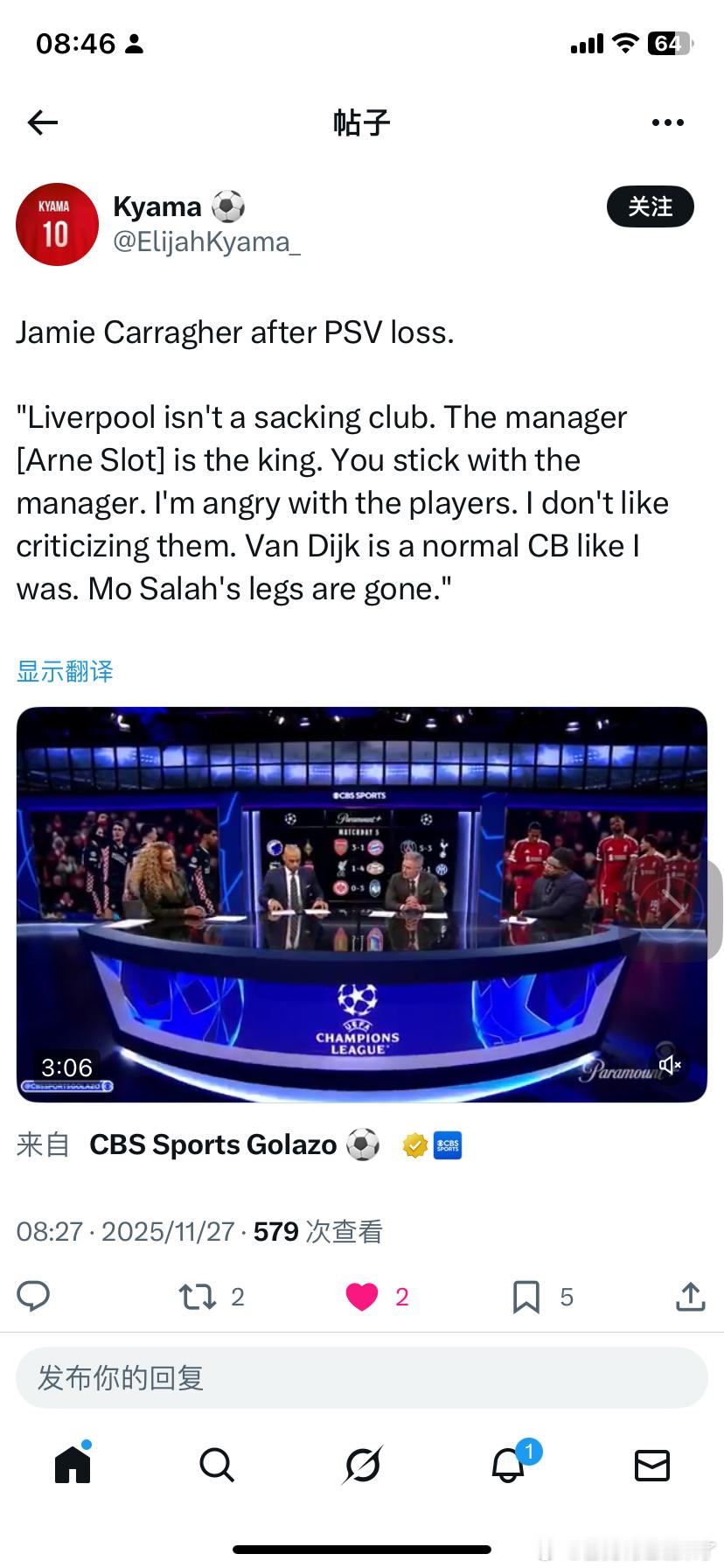 卡拉格赛后锐评:"利物浦从来不是家会轻易炒教练的俱乐部。主帅(斯洛特)就是国王,必须力挺到底。让我愤怒的是球员——我不愿批评他们,但范迪克如今已沦为平庸中卫,就像当年的我;萨拉赫的双腿再也蹬不上劲。"