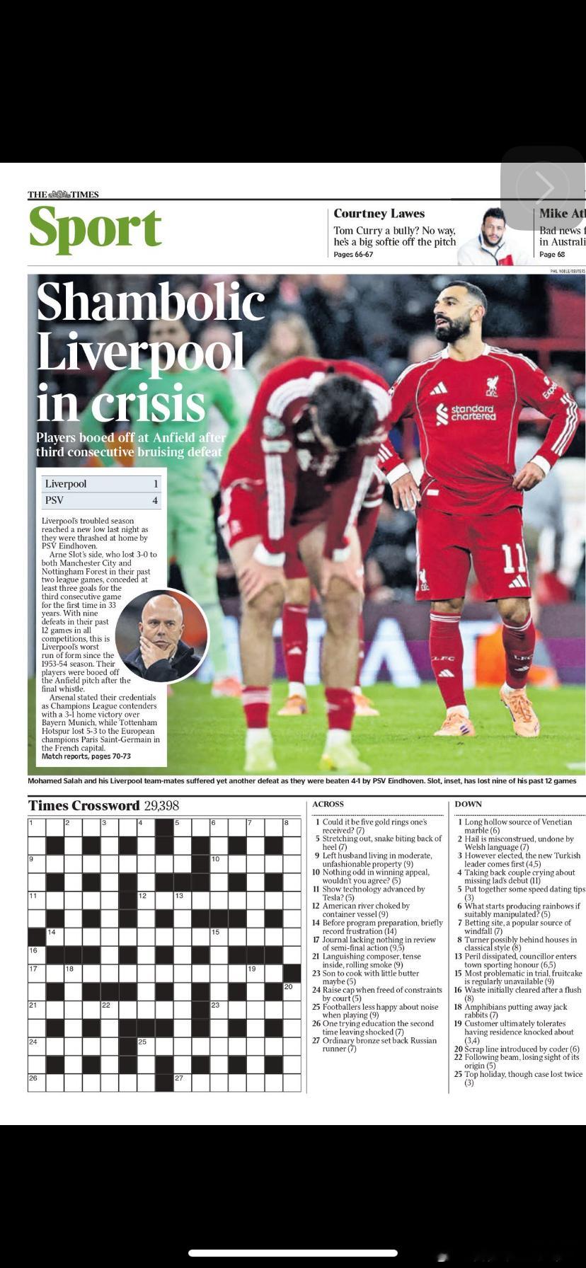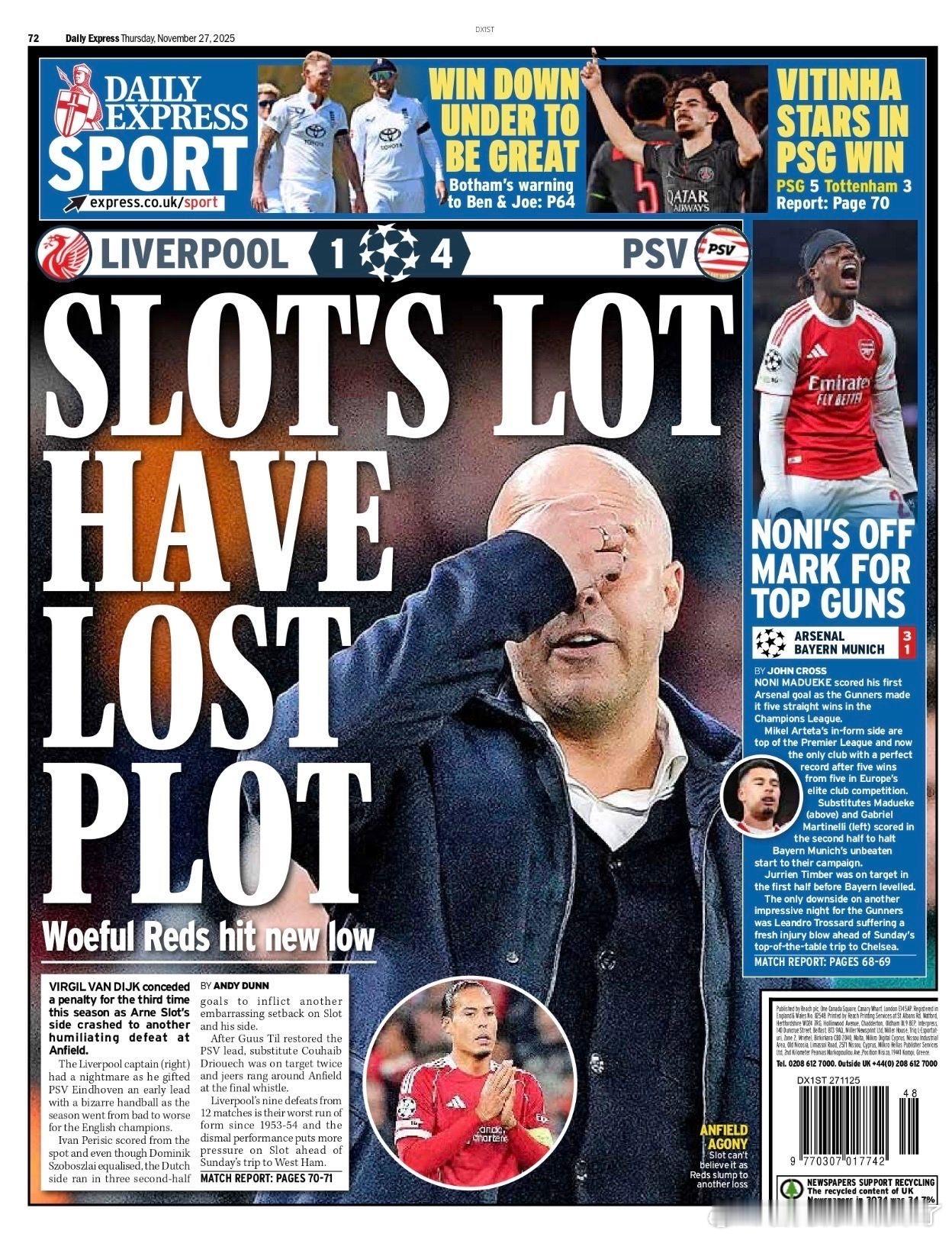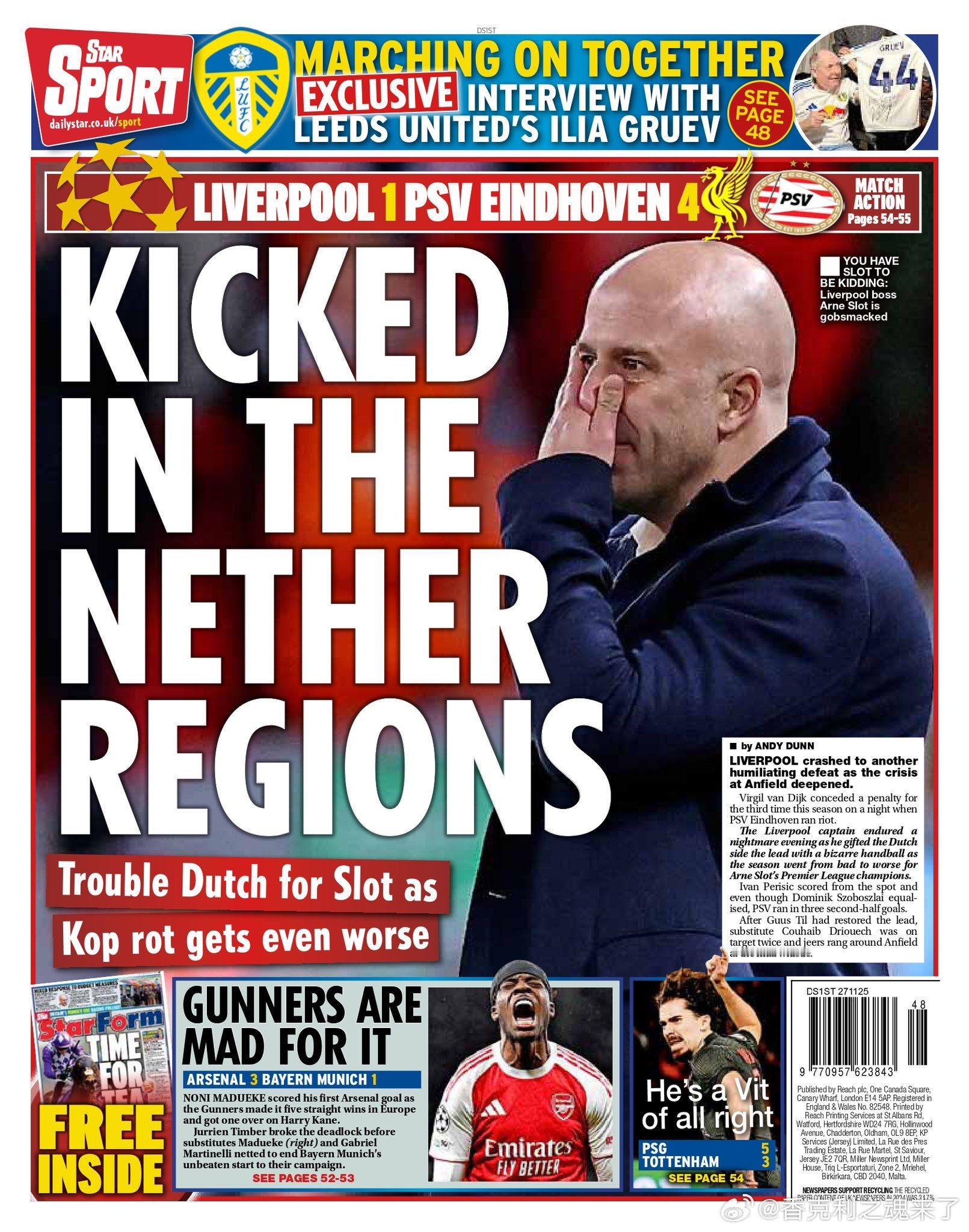 泰晤士报标题混乱不堪的利物浦陷入危机每日快报SLOT'S LOT HAVE LOST PLOT”斯洛特军团彻底失控每日星报荷枪实弹,惨遭重击斯帅荷兰劫难,红军泥足深陷泰晤士报红色警报,斯洛特! 利物浦受辱,从危机升级为全面紧急状态