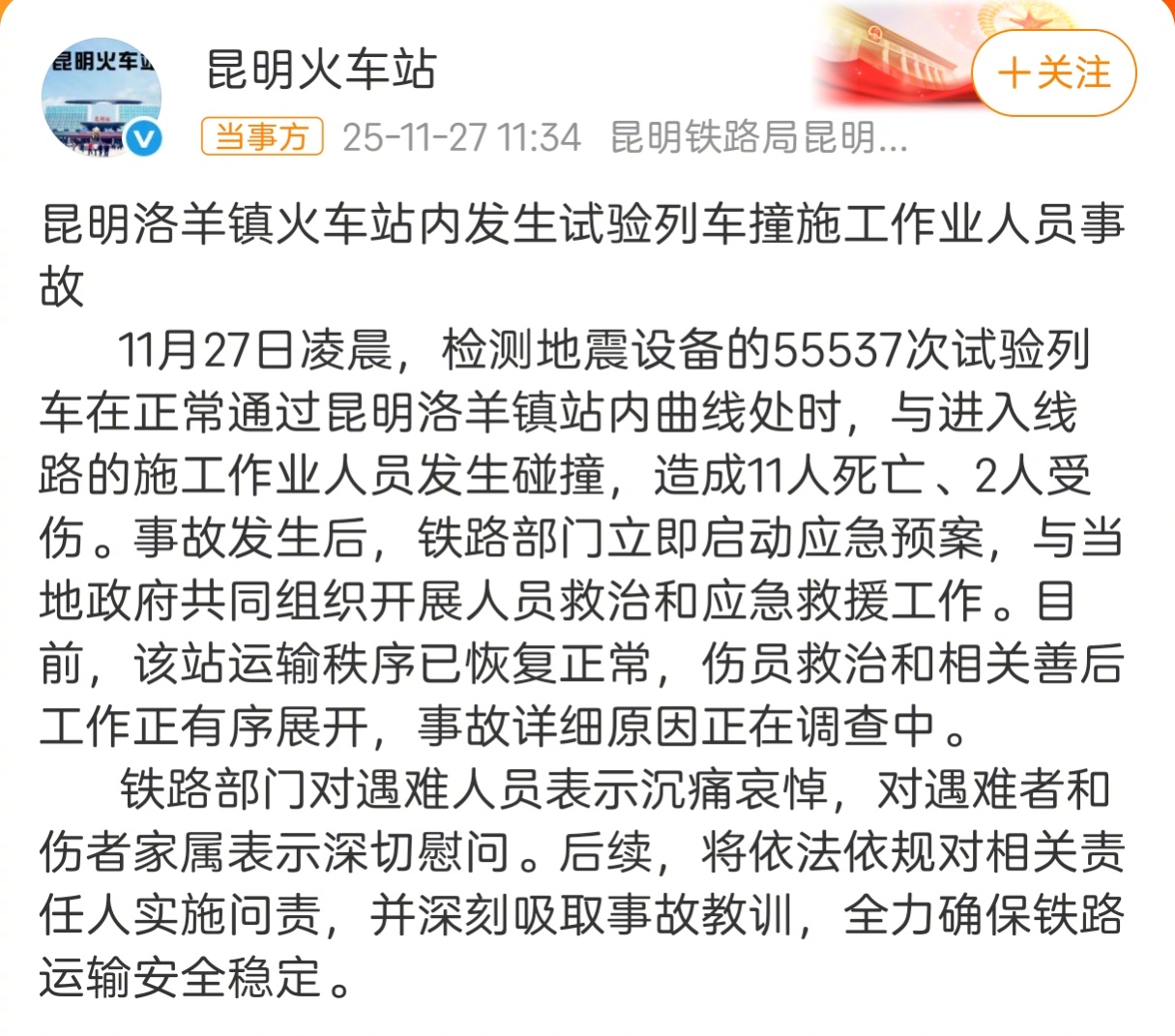 如此致命的管理疏漏也能发生,真是可悲!#昆明一火车站试验列车撞人致11死#