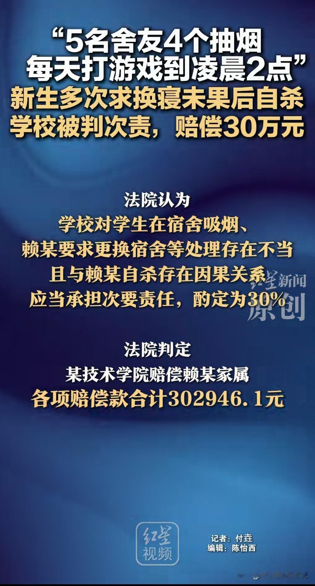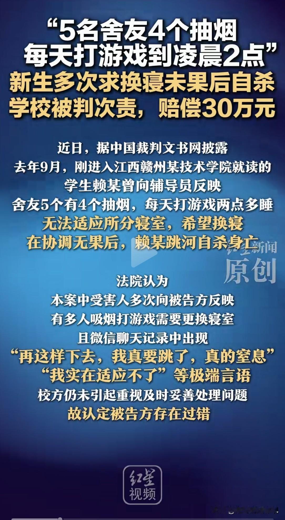 江西赣州,某技术学院新生入学第3天,向辅导员诉求,宿舍5名室友4人抽烟,室内乌烟瘴气遍地烟头,而且同学每晚打游戏到凌晨甚至通宵,自己无法适应,要求调换宿舍。其多次反映情况,没得到及时解决,该新生在入学不到一周就跳河自杀。家属无法接受这一现实,认为孩子反映的情况,没得到学校重视,造成事故后果,逐向法院提起诉讼。法院判了! 2014年9月份,赖同学考入某技术学院,他一心想学习技术,早日参加工作。 入学后,赖同学分了宿舍,他也想和同学搞好关系。 可入住后赖同学却发现,宿舍里5名舍友,有4名都有吸烟的习惯。 全宿舍只有他一个人不抽烟,这不但显得他很不合群,而且乌烟瘴气的环境他也受不了。 刚开始他也试图适应,可第3天他就忍受不了了。 且同寝室的同学,不但晚上在房间内抽烟,就连课后也跑回宿舍抽。 这对于从不抽烟,而且对烟味极其敏感的赖同学来说,简直就是一种折磨。 晚上他想在宿舍复习功课,却被烟味熏的头疼欲裂,根本学不下去。 几个同学还玩游戏,常常玩到凌晨,甚至玩整晚。 期间还伴随着游戏的情节,发出吵闹尖叫声。 别说学习了,就连睡个好觉都很难。 赖同学感到实在无法适应宿舍的环境,更和其他同学难以相处。 赖某是新生,2024年9月18日入学报道。 3天后,在无法忍受的情况下,他向辅导员罗某某发了信息,自己想换个宿舍。 信息内容显示,宿舍5名室友有4人抽烟,他实在适应不了,请求换宿舍。 辅导员罗某某收到信息后回复赖同学:太远了,不好管理。 随后赖同学再次请求说:我是真适应不了,他们每天都在宿舍打游戏,2点多钟才睡觉,这有点影响睡眠。 后面罗辅导员和赖同学有过两次语音通话,通话内容无从得知。 出事后,赖同学的父母提出,赖某所住的宿舍,空间狭窄遍地烟头,令人窒息。 儿子从不抽烟,而且对烟味极其敏感,因此多次请求老师和辅导员要求调换宿舍。 但并未引起老师和辅导员的注意。 不但未及时调帮助调换宿舍,更没注意到孩子的心理和情绪变化。 对其及时进行心理疏导,导致孩子绝望,最终造成了事故的直接发生。 9月23日,辅导员发现给赖同学语音沟通时,其没有及时回复。 再联系不到赖同学后,学校报警。 那一天,赖同学刚入学还不到一周的时间。 第二天,赖同学的尸体被从河中打捞起来。 经法医对尸体的勘查,确认尸体无外伤,排除他杀和刑事案件。 赖同学在实在无法适应本宿舍环境,自觉调换宿舍得不到及时解决的情况下,绝望跳河自杀。 其父母无法接受这一现实,儿子刚刚成年,考入技术学院入学还不到一周。 家属认为,儿子是在实在无法适应宿舍环境,无法排解心中的情绪后,才做出了艰难的抉择。 儿子给辅导员的沟通中,甚至明确说明:“情况已严重到自己喘不过气来,想要跳楼。” 但学校仍然没有重视,没有解决问题,导致赖某情绪终于失控。 在学校封闭式管理,严控学校外出的情况下。赖某最终跳河身亡。 法庭上,校方辩称:该事故并非意外,而是赖同学主观上追求死亡的结果。 而赖某已年满18岁,对自己的行为,应有足够的自控力。 对自身行为产生的后果,有充分的理解能力。 所以,赖某应为自己的自杀行为承担全部后果与责任。 对赖某家属称,学校不负责任,没及时调换宿舍,导致事故发生。 学校有证据证明,辅导员已多次明确表明可以调换宿舍的承诺,并对其进行了情绪安抚。 一审,法院审理后认为,赖某属于完全民事行为能力人,其结束生命应由个人承担主要责任。 赖某多次向校方反映,宿舍多人吸烟、打游戏,需要更换寝室。 校方仍未引起重视,及时妥善处理问题,认定校在方存在过错。 且与赖某自杀存在因果关系,故校方应承担30%的次要责任。 《民法典》第1198条:学校、幼儿园等教育机构对未成年人或无民事行为能力人、限制民事行为能力人负有教育、管理、保护的义务,未尽到义务造成损害的,应当承担侵权责任。 高校对学生在校期间的合理诉求,负有及时处理和管理的义务。 赖同学多次反映宿舍吸烟、噪音问题,影响正常学习生活。 甚至提及“喘不过气、想跳楼”的极端情绪,校方未及时协调调换宿舍,或进行有效心理疏导,未充分履行保护义务,存在过错。 校方的疏忽,与悲剧存在一定因果关系。 《民法典》第1165条:行为人因过错侵害他人民事权益造成损害的,应当承担侵权责任。 赖同学已成年,自杀行为主要由其自身决定,需承担主要责任。 但校方在处理学生合理诉求时,存在拖延和疏忽,未对学生极端情绪进行干预。 这种过错行为,间接加剧了悲剧发生,需按过错比例承担30%赔偿责任。 校方虽有责任,但自杀主要是个人选择,校方承担部分责任而非全部。 最终,法院一审判决,校方赔偿赖某家属合计302946.1元。 技校生入学不到一周自杀身亡,你怎么看?