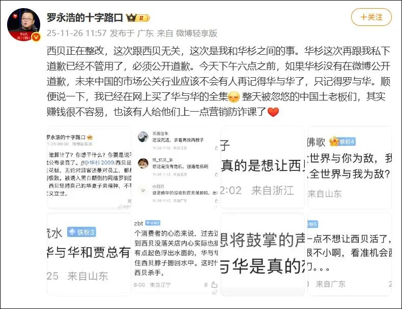 华与华突然挑起事端,罗永浩怒了,西贝无辜躺枪,贾国龙可能要哭了。就当大家以为西贝预制菜风波已经过去之际,华与华老板莫名其妙的一句话,瞬间点燃新的战火,只因他说“西贝被诱入黑白颠倒的罗刹国,被人算计”,稍微了解事件经过的人,一眼就知道这字里行间骂的人就是罗永浩。不出所料,向来没有隔夜仇的老罗直接开炮,深夜点名华与华把话说清楚,还下最后通牒,要求当天下午6点前公开道歉,扬言会让华与华付出惨痛代价。 结果是无数吃瓜网友静待到下午6点,华与华一直都没有吱声,应该也没有私下跟罗永浩道歉。至此可以说这起无端风波升级到了一个新高度,接下来罗永浩可能要出狠招了,他威胁会公开录音,可能是此前西贝事件帮腔时私下找老罗道歉的录音,也可能是其他相关事件,总之定然是对华与华十分不利。 这事说起来,不怪老罗挑理,华与华作为国内品牌营销界的宗师级人物,真不该在西北风波刚过去的当口,再去招惹罗永浩。说难听点,这事处理不好,西北都得跟着遭殃,本来因为预制菜风波损失惨重,大降菜价、发优惠券都是在给这起事件善后,还是没撑住全国全掉了几十家门店。就这也只能算是勉强稳住了下滑态势,危机并没有彻底解决,看似一些城市排队去西贝吃饭,哪个不是看在那些大额券的份上? 这个节骨眼上华与华又没事给贾国龙添堵,这几年6000万的咨询费,多少人怕是又要为贾老板抱不平了。希望这事能尽快了结,华与华服不服软是小事,西贝是真的怕了。