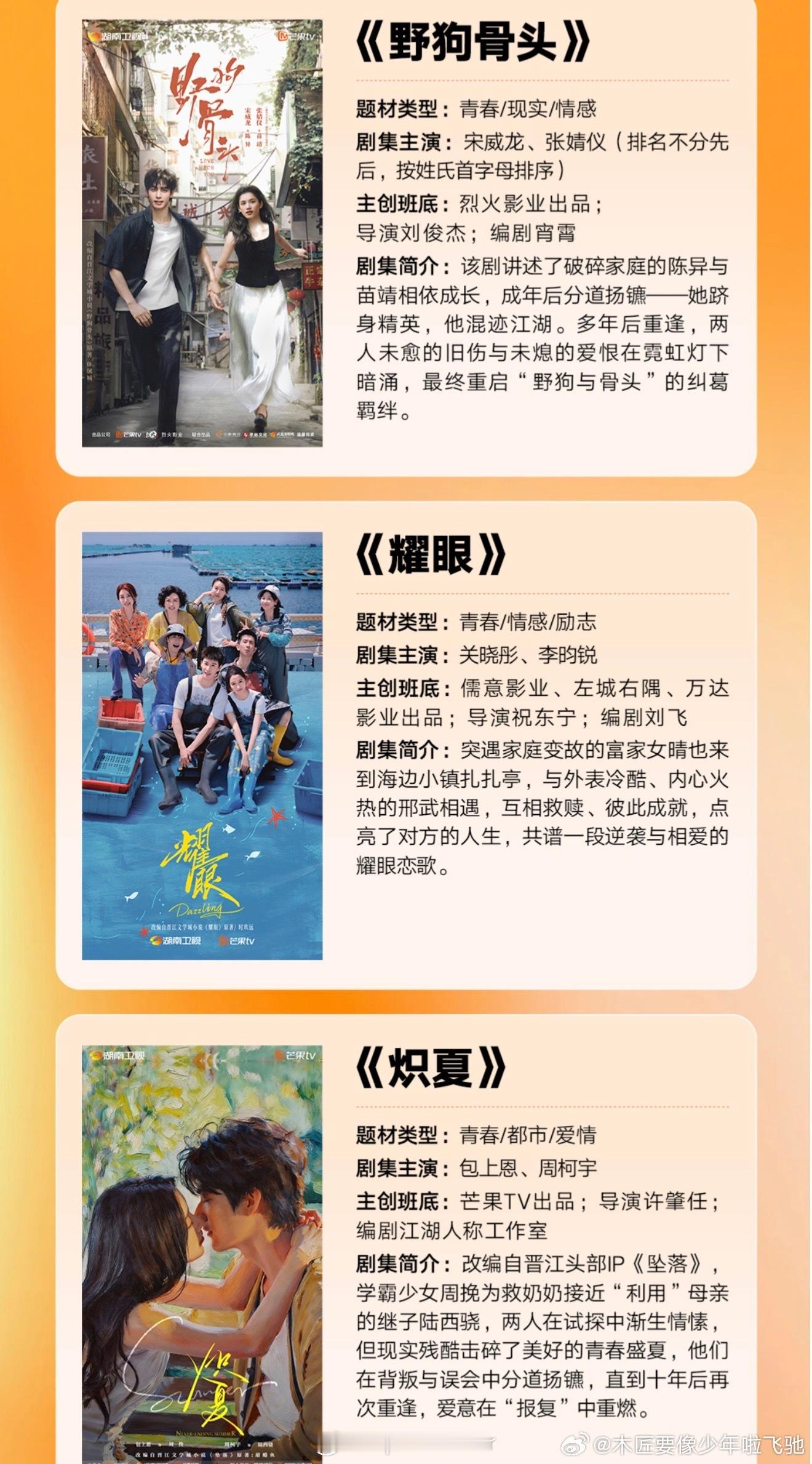 芒果明年请不到一线班底和一线国民度演员刘亦菲、闫妮、杨紫、李现之类的来做像《去有风的地方》《小巷人家》《国色芳华》这种大制作爆款剧集。现在的路线就是专门请大热流量演员来演古偶、现偶,有流量粉丝来冲数据,买周边,芒果也赚很多。比如罗云熙《水龙吟》,王鹤棣《咸鱼飞升》,宋威龙《野狗骨头》,李昀锐《耀眼》,陈哲远《江山为聘》,许凯《天都异闻录》,侯明昊《玉茗茶骨》。其实这样也挺好的。总比那些没有流量又没有国民度的腰部演员演的都市剧古装剧好太多……