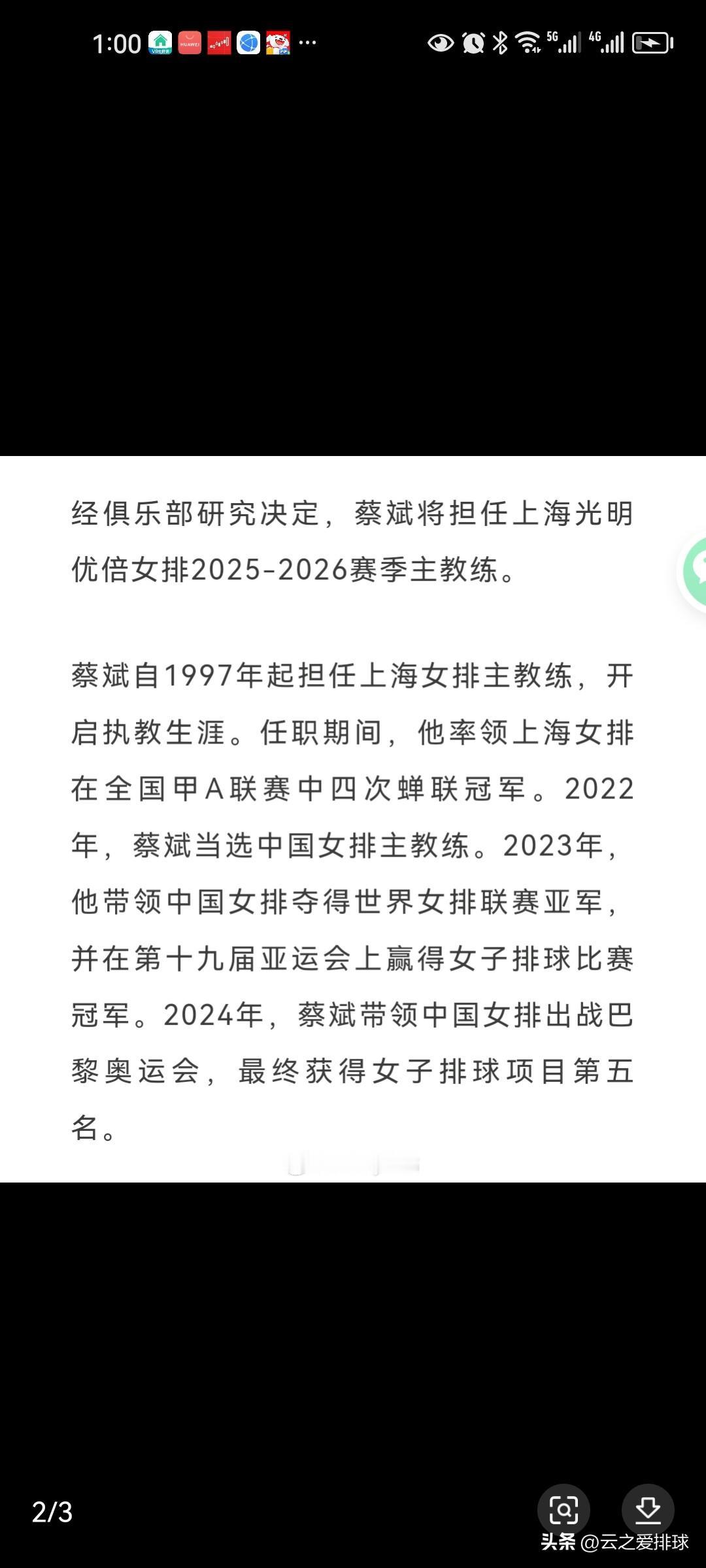 蔡斌让传言照进了现实! 上海光明优倍女排官宣蔡斌加盟。 可能全运会上海女排的成绩不够理想,王之腾被置换。似乎也在意料之中! 图1,上海女排全员集合,蔡斌在前面讲话。 说句实话:蔡斌在国际比赛执教保守,应变能力有点差,但是在国内完全够用! 相信随着蔡斌的助力,本赛季上海女排实力会有提升,个人觉得有希望摘得本届排超联赛的冠军。 目前范赖克和沃隆科娃已经全部抵达上海,图1右侧这俩妞都在!她俩的加盟增强了上海的边攻实力。 除了边攻,上海女排副攻、二传位置都不错。 上海女排的春天要来了!