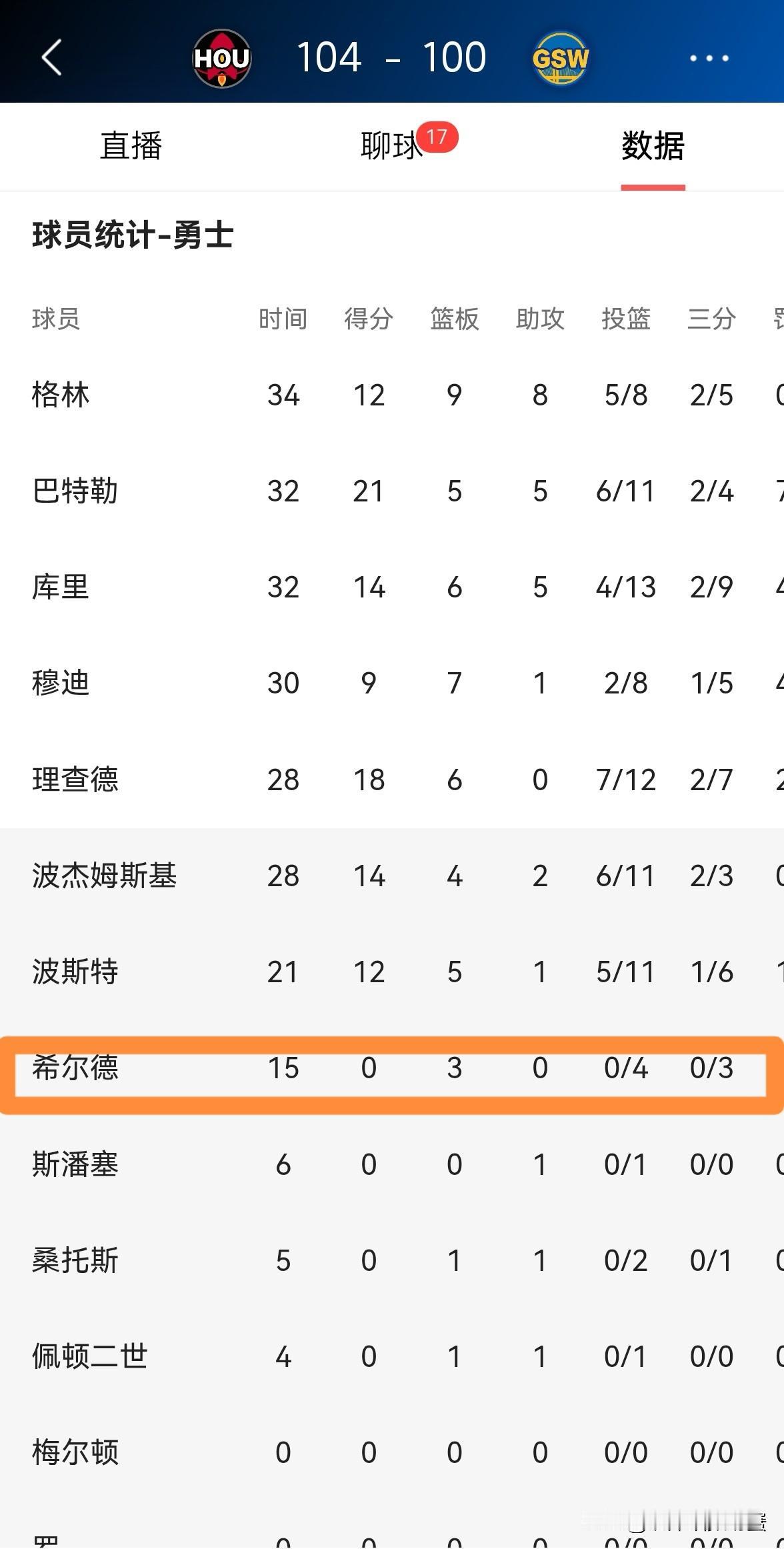 我强烈建议勇士管理层立刻交易走希尔德!在今天勇士主场以100:104不敌火箭的比赛中,希尔德的表现简直不忍直视。全场比赛下来,希尔德替补出战15分钟,投篮4中0,其中三分球3中0怒砍0分,他的场上正负值为-10。 每当勇士面对强队的时候,希尔德就会拉胯,这已经成为了他的习惯,而这样的习惯对勇士是百害而无一利,勇士应该趁早交易走希尔德。