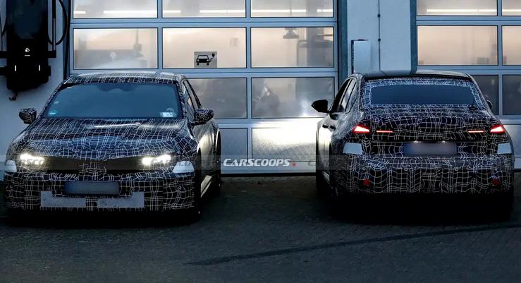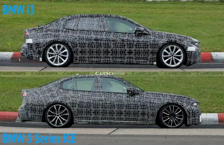 设计细节差异较大 全新宝马3系/i3高清谍照同框 近日,汽节车社从相关渠道获取到了一组全新宝马3系和全新宝马i3同框的谍照。 两款车型均采用Neue Klasse概念车风格,但在多处外观细节上不同。预计全新宝马3系/i3都将于2026年发布,全新3系将基于现款车型的CLAR平台的升级版本打造,而全新i3则基于Neue Klasse平台打造。 全新宝马3系和i3采用Neue Klasse概念车风格的前脸设计,但3系拥有一个显著的底部进气口,并似乎配备了主动式进气格栅。i3的底部保险杠虽被伪装网覆盖,但预计会采用类似设计。通过车身侧面线条能够看到,两款车型拥有不同的车顶轮廓线,i3的车顶相对平直,预计是因为纯电的底盘结构更厚一些 ,所以需要更平直的车顶来保障车内有足够空间。而全新3系则带有微妙的溜背造型,更显运动流畅。 另外,侧窗造型与后门设计也有不同,3系的后门分隔线近乎垂直,而i3则采用更具棱角的设计。 同时,i3还曝光了一张内饰谍照,车内配备独立的中控屏,可能与全新iX3类似。同时,方向盘造型也有所变化,其余内饰目前还覆盖着厚重的伪装材质。动力方面,预计全新i3将会配备单电机与双电机系统,配备800V架构,入门车型便可提供超过300马力的最大功率。全新3系可能将会提供燃油版和插混版车型,可能将搭载2.0T涡轮增压发动机+电机,纯电续航预计超过100km。 点个关注吧!汽节车社,车圈热点资讯每日一扫清!【来自懂车帝车友圈】
