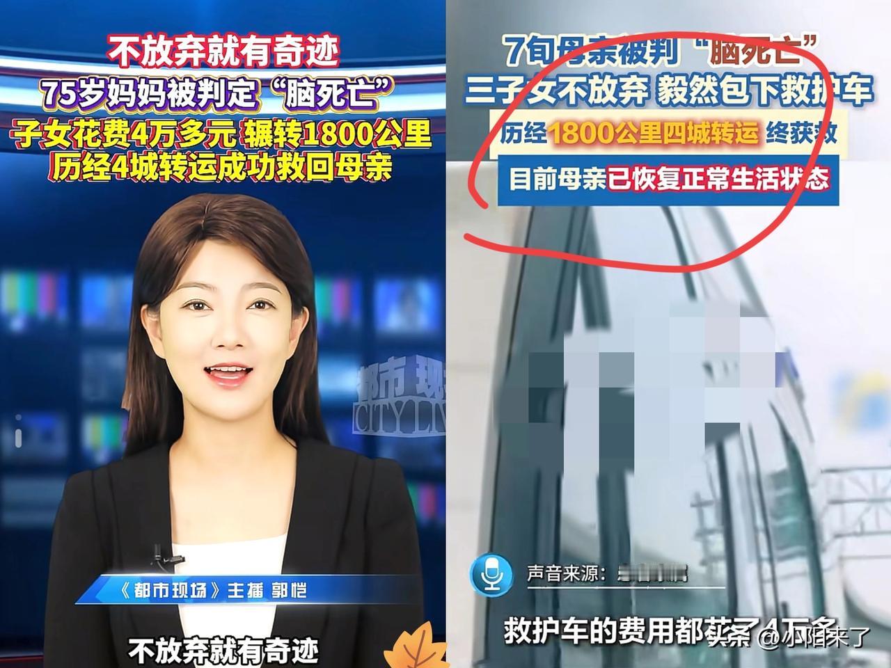 泪目了! 甘肃,一位75岁老人被判脑死亡,可三位儿女不信邪,花4万块包下救护车,1800公里路程,辗转四座城市,硬生生把靠呼吸机维持生命的母亲,从死神手里往回拽! 到西安医院时,老人已经脑疝,一侧瞳孔都散了,大夫直言“年龄大、风险极高,大概率人财两空”,可女儿红着眼眶哽咽:“求您再试试,我不想空着手把妈妈接回去”! 最终老人奇迹般恢复自主意识,有人说这是运气,可我偏觉得,哪有什么从天而降的奇迹,全是子女用孝心和坚持堆出来的底气! 不是医生敢赌,是儿女的不放弃给了医生赌的勇气;不是命运偏爱,是“你养我小,我护你老”的执念,硬生生扛住了所有绝望! 总有人说“久病床前无孝子”,可这三个儿女用行动撕开了偏见:真正的孝顺,从不是顺境里的陪伴,而是绝境中宁愿倾家荡产,也不愿松开父母的手! 这份刻在骨子里的坚守,才是人世间最戳心的温暖!
