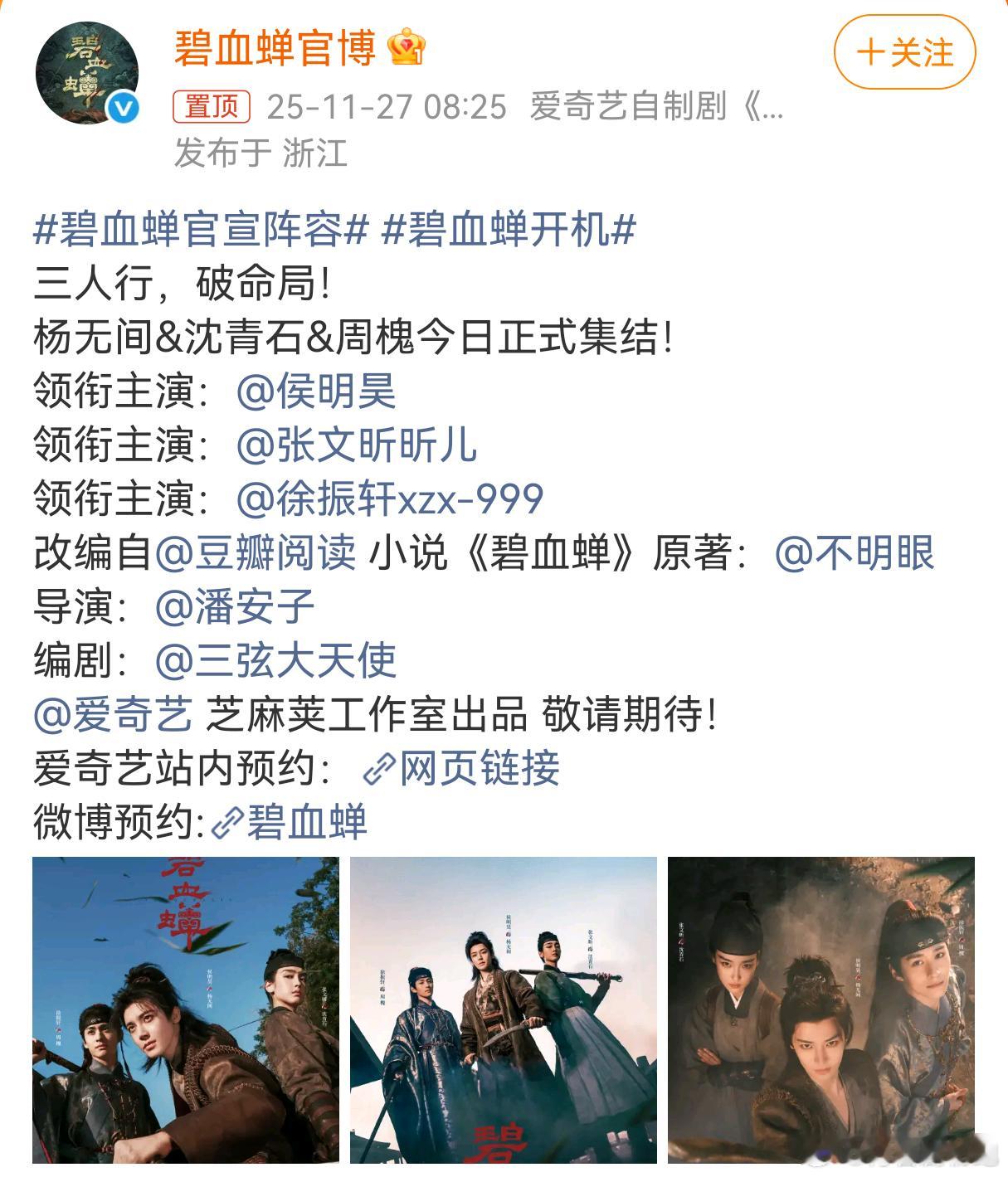 侯明昊、张文昕、徐振轩主演的《碧血蝉》阵容官宣,㊗️《碧血蝉》开机大吉,拍摄顺利