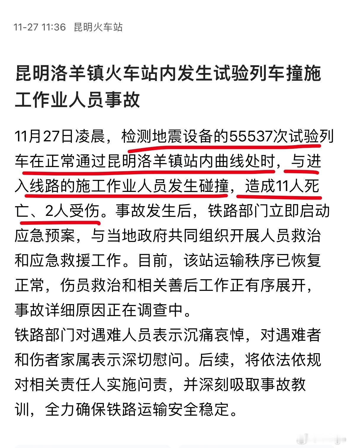 昆明一火车站试验列车撞人致11死这事怎么看怎么离谱,怎么能发生这样低级的错误?11人死亡2人受伤,没有提前沟通的吗? 碰撞事故致11死铁路部门将问责