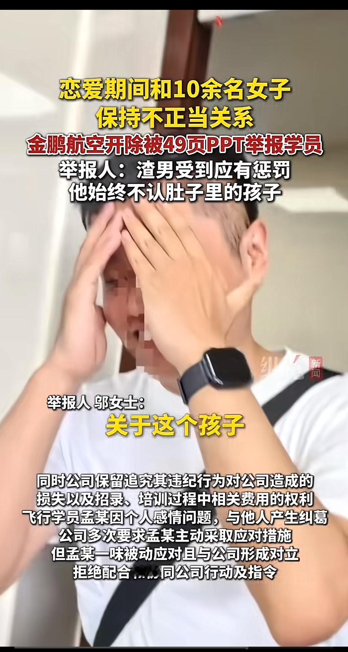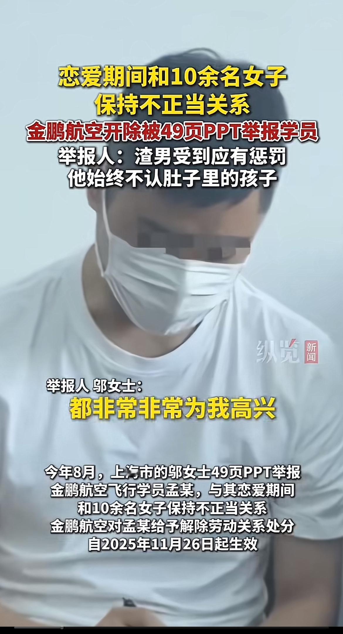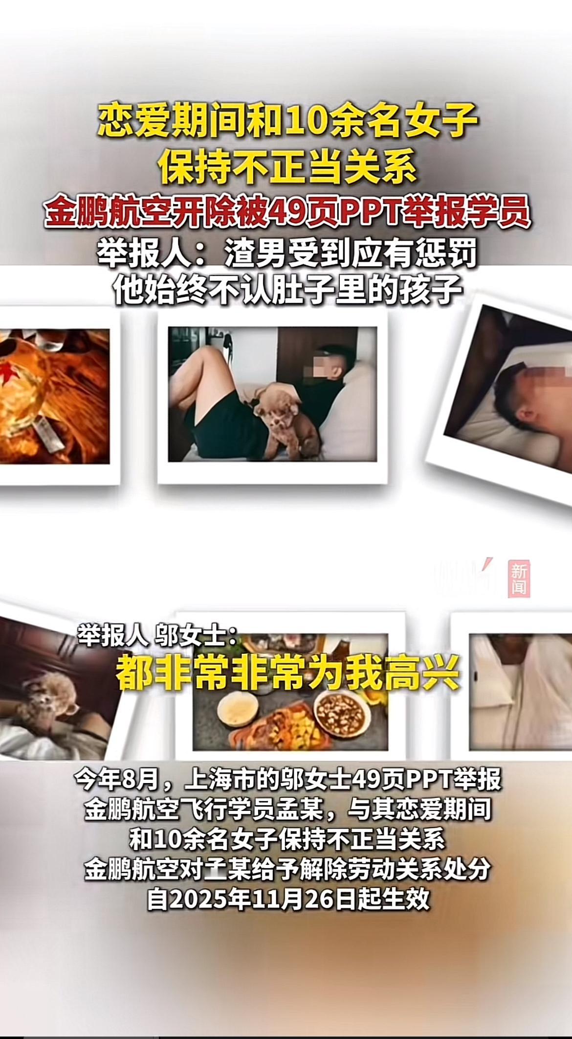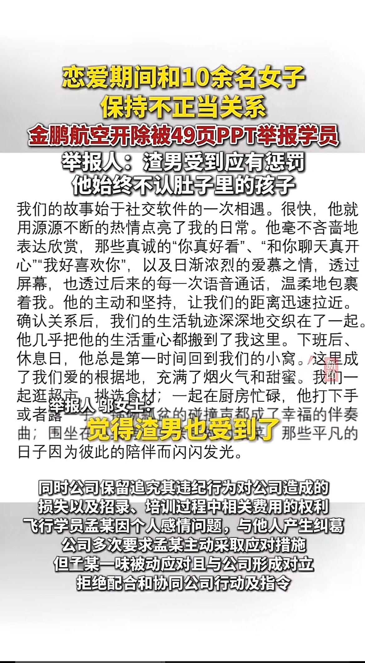 现在的渣男真是防不胜防啊!上海邬女士就遭遇了这么个极品。金鹏航空飞行学员孟某,和邬女士恋爱时竟与10余名女子保持不正当关系,交往前还隐瞒自己有5年女友,让邬女士当了小三,甚至怀了他的孩子。 邬女士发现后想揭露渣男,结果孟某倒先把她告到派出所,调解时原形毕露。邬女士直接甩出49页PPT举报。金鹏航空也不含糊,直接解除与孟某的劳动关系。孟某不承认孩子,还不配合公司,这下算是自食恶果。邬女士终于让渣男受到了应有的惩罚,真是大快人心!